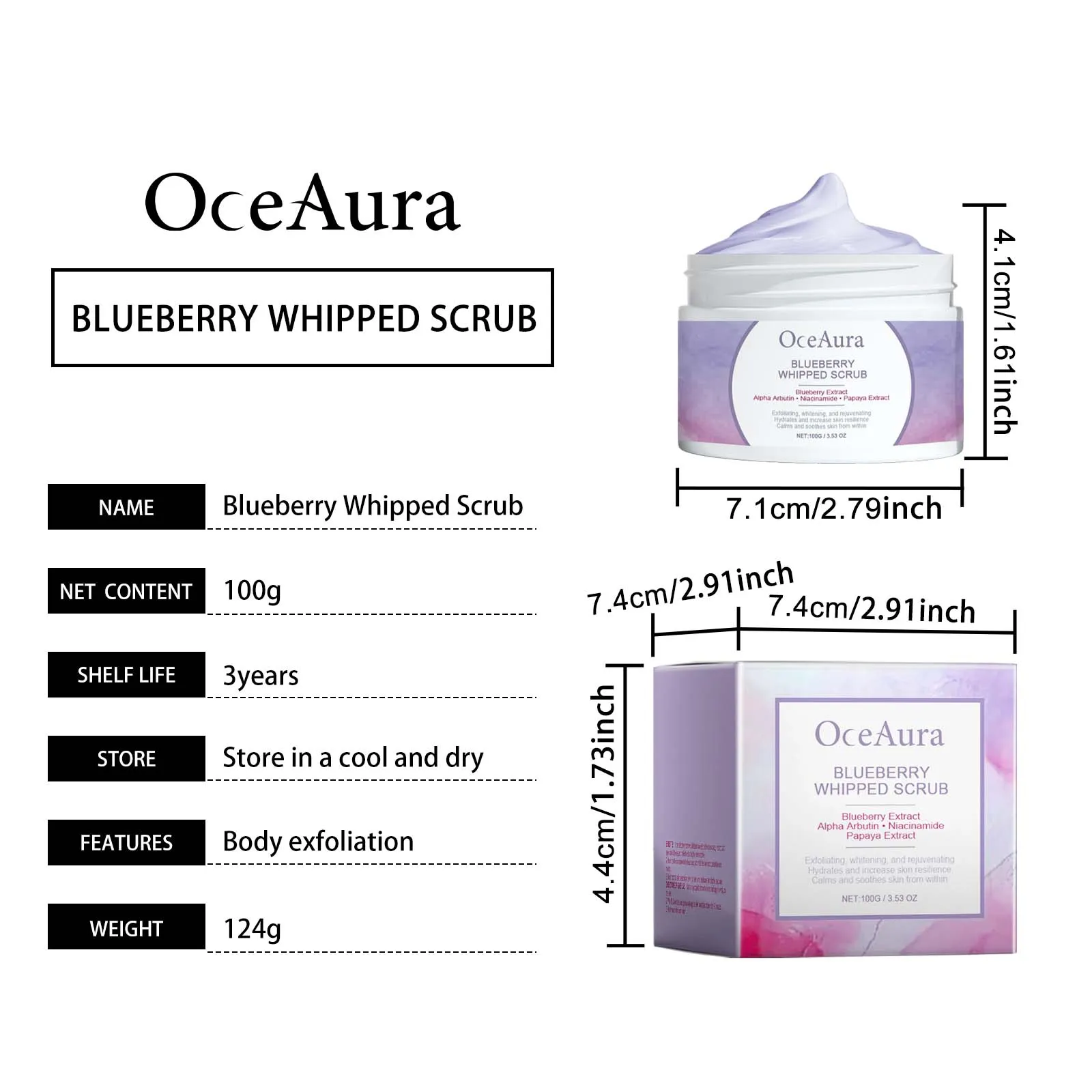 Exfoliate and brighten your skin with the OceAura Blueberry Whipped Scrub. Infused with blueberry extract, papaya extract, and niacinamide for soft, glowing skin.