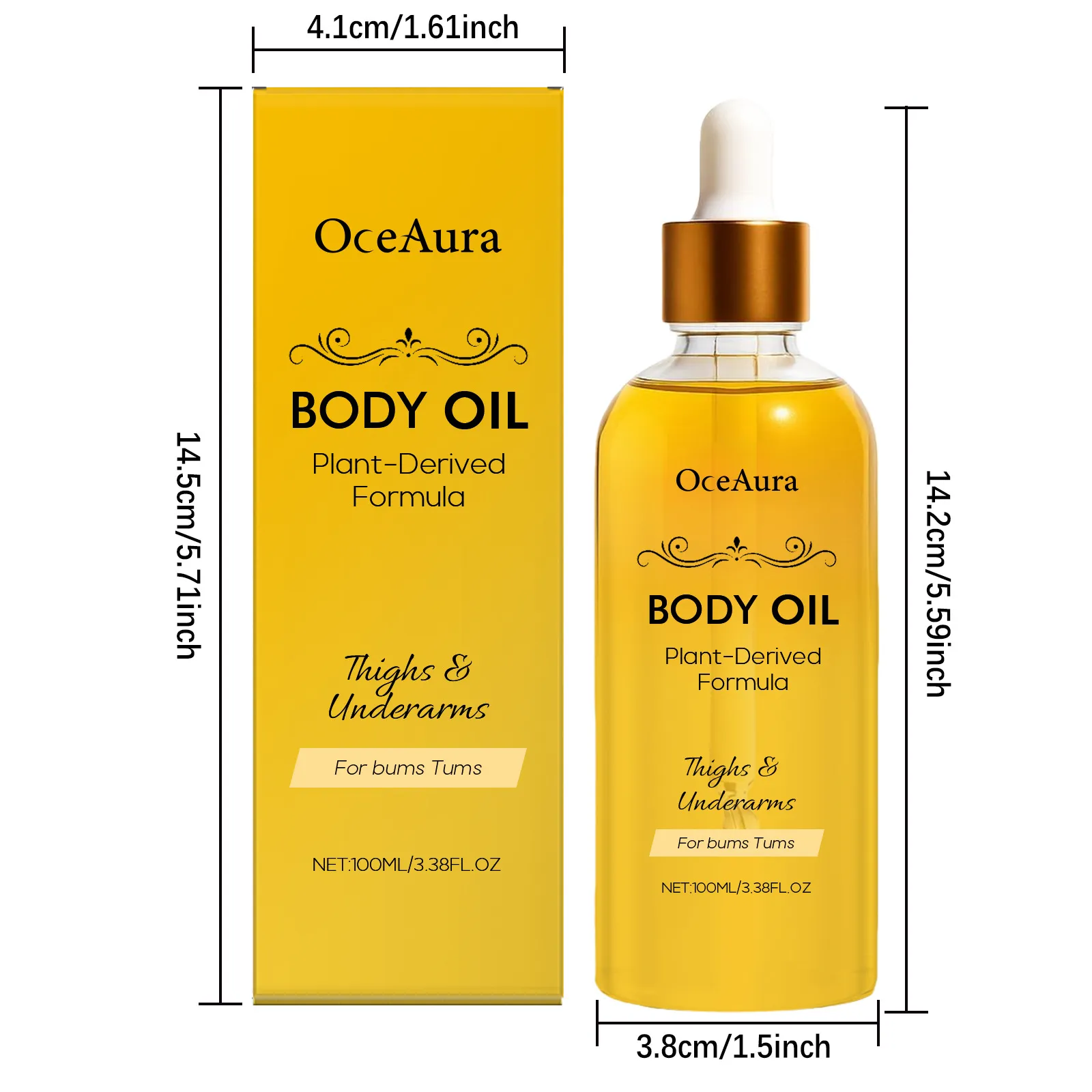 OceAura Body Oil with a plant-derived formula, perfect for nourishing, hydrating, and smoothing your thighs and underarms. Non-greasy, quick-absorbing oil for healthier, more radiant skin.