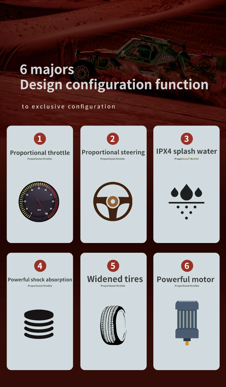 4, 2.4G full proportional synchronous remote control system. Full throttle/steering;