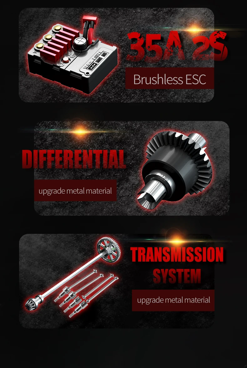Model: 16101PRO/16102PROTop speed: 70km/hUse time: about 15-18 minutesCharging time: about 1.5 hoursRemote control mode: 2.4G remote controlRemote control distance: ≥120mDrive motor: Brushless motorBattery: 7.4V 1500Mah 15CRemote control battery: "AA" battery *3 (Not include)Wheel base: 188mmWheel diameter: 85mmBody size:30*23*11.5 CMModel: 16101/16102Maximum speed:50KM/H