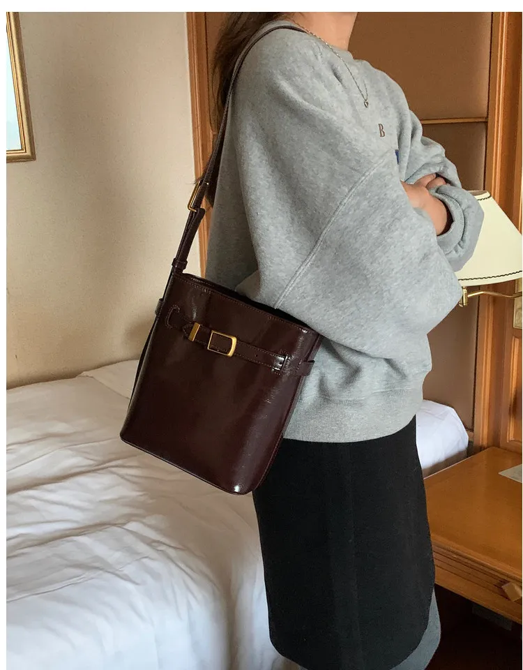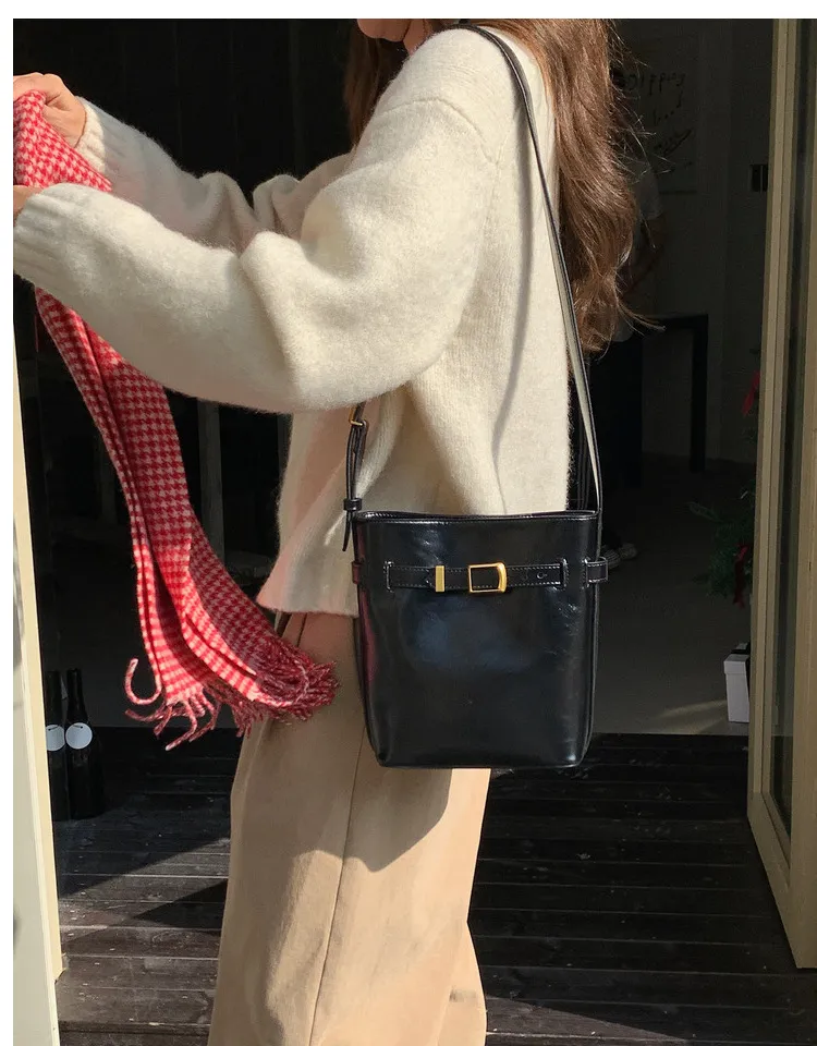 Add a touch of vintage elegance to your look with the Oil Wax Leather Shoulder Messenger Bag, a retro-inspired bucket bag designed for style and functionality. Made from premium oil wax leather, this bag features a rich, glossy finish that enhances its classic appeal and gives it a luxurious, timeless look. The bucket shape offers ample space for your essentials, making it perfect for everyday use, whether you’re heading to work, running errands, or enjoying a casual day out. The adjustable shoulder strap allows for comfortable crossbody or shoulder wear, providing versatility and ease of use for your on-the-go lifestyle.