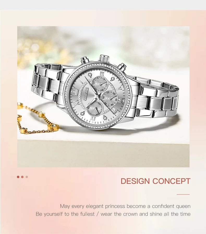 The OLEVS Women’s Quartz Watch is not just about looking good, it’s also about providing functionality. The three small dials offer additional features that are both useful and stylish. These small dials typically represent: