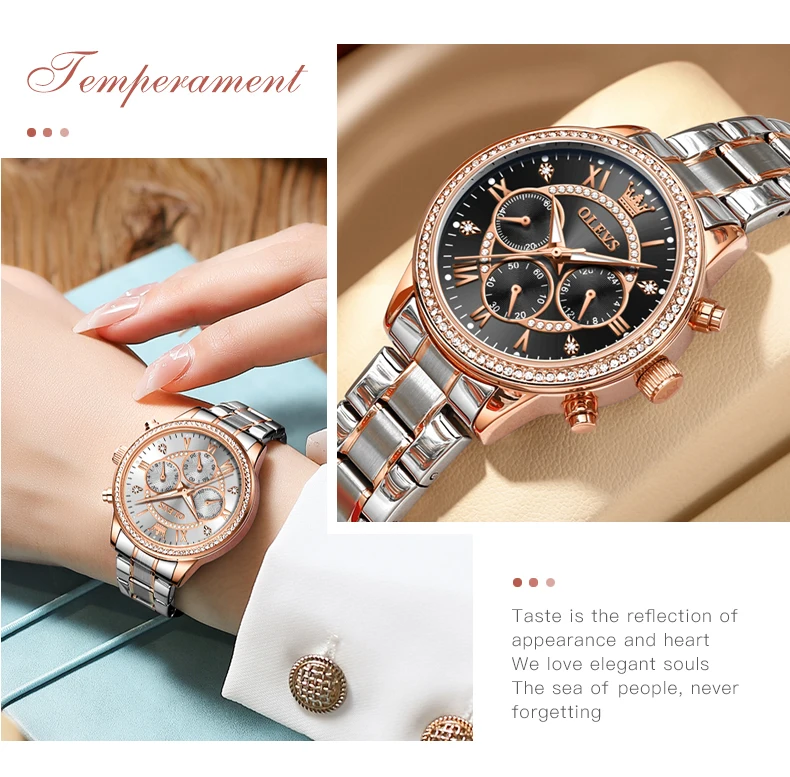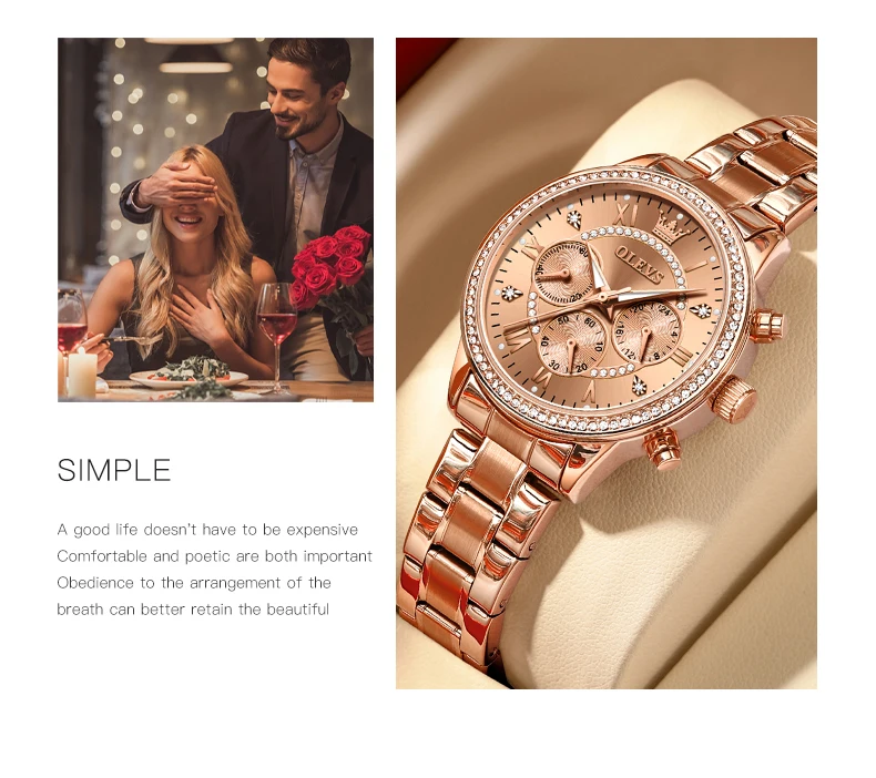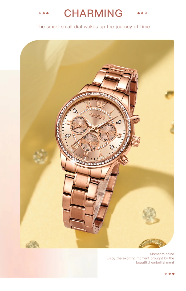 When it comes to timepieces, there's no better way to showcase your elegance and sophistication than with the OLEVS Women’s Quartz Watch with Diamond Dial. This gold stainless steel watch blends timeless luxury with modern precision, providing women with a versatile and stylish accessory that is perfect for any occasion. Adorned with a luxury diamond dial and featuring a waterproof design, this watch is more than just a way to keep track of time—it’s a statement piece that enhances your style and reflects your personality. With its three small dials offering enhanced functionality and beauty, this fashion-forward wristwatch ensures you’re not just on time, but also in style.