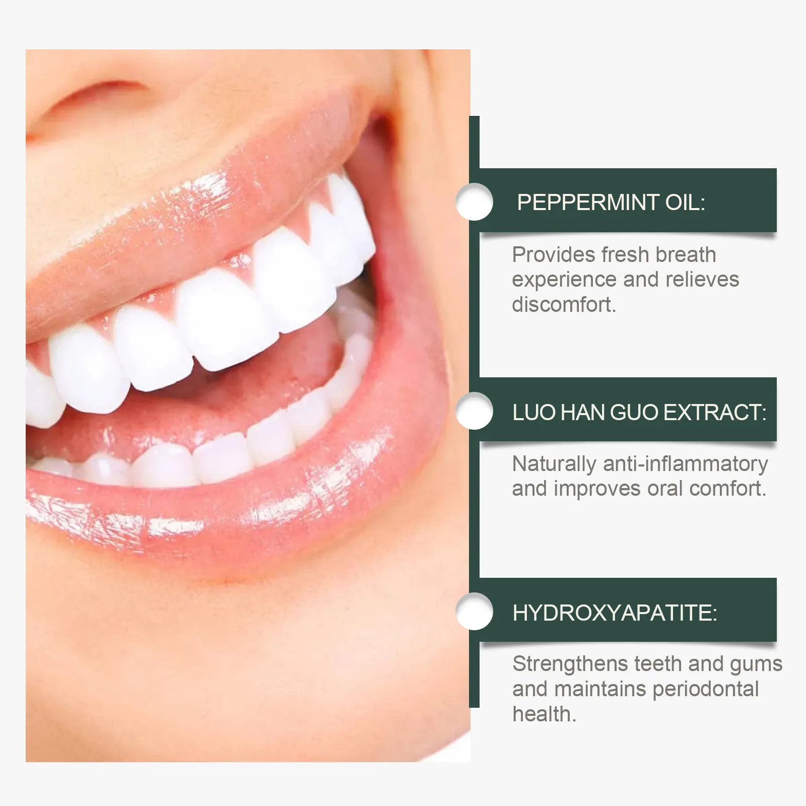 Material: water, peppermint oil, momordica grosvenori extract, hydroxyapatite, zinc oxide