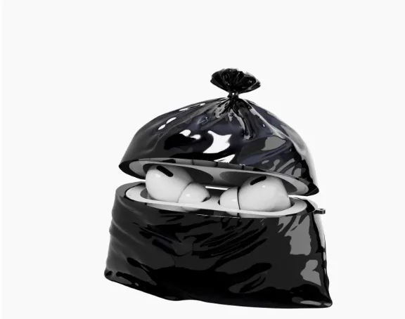 earbud storage. Crafted from high-quality black silicone with a design inspired by the classic “trash bag” shape—complete with subtle folds