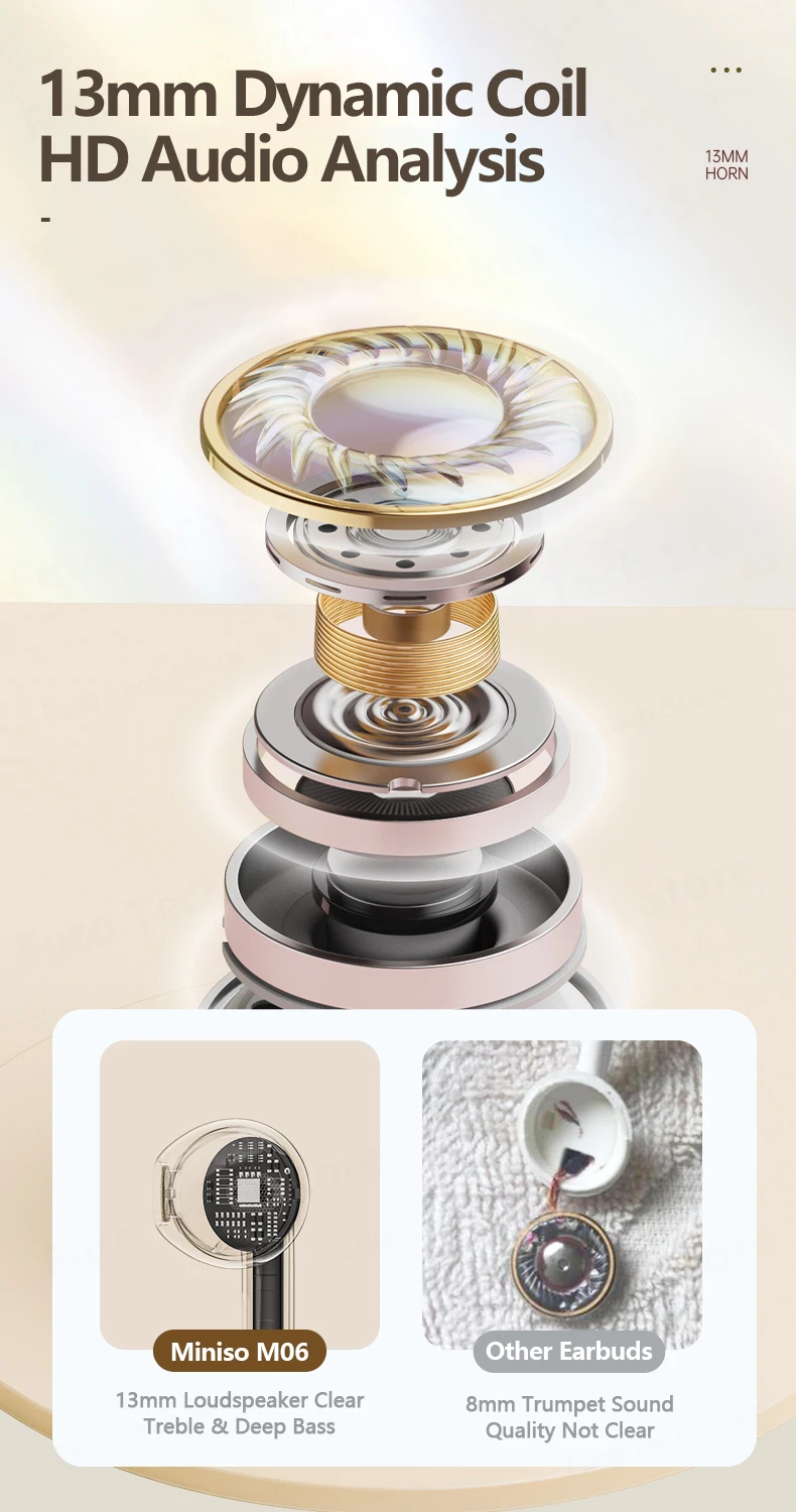 [Miniso M06]:13mm Loudspeaker Clear Treble & Deep Bass VS [Other Earbuds]: 8mm Trumpet Sound Quality Not Clear