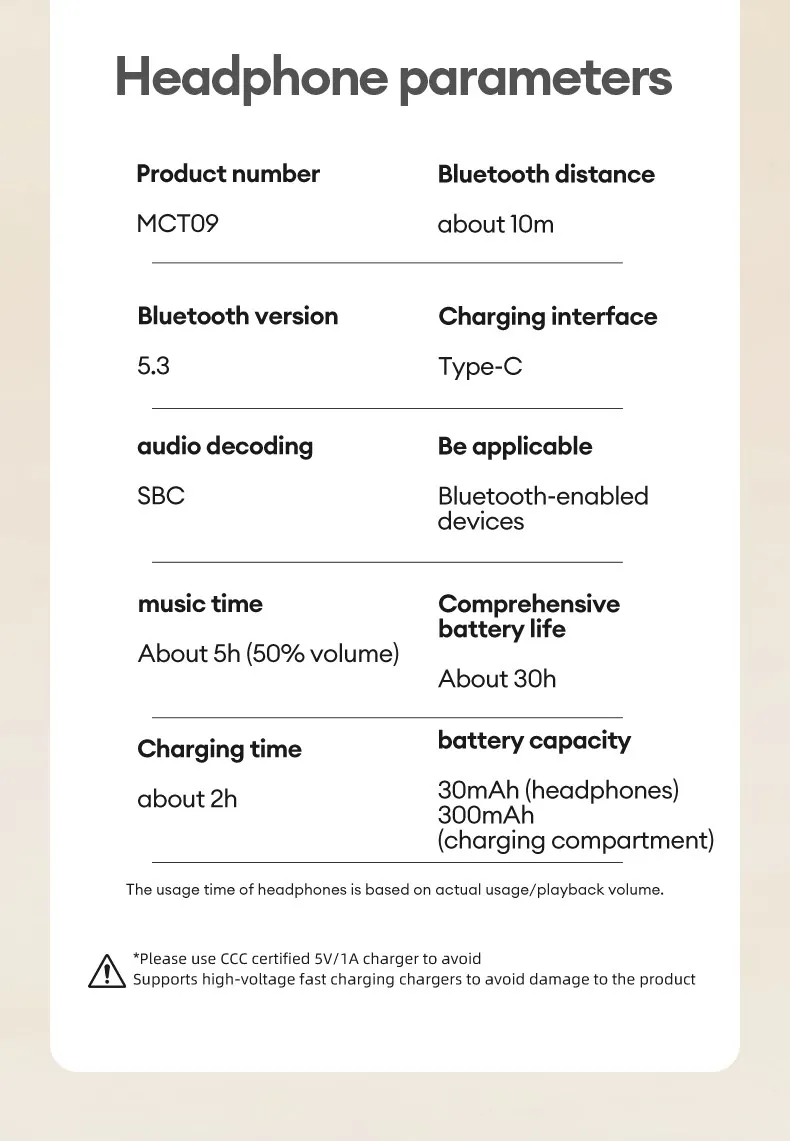 - Bluetooth V5.3: Equipped with the latest Bluetooth technology, the MCT09 offers stable and efficient connectivity with minimal latency. Enjoy seamless pairing with your devices and a strong signal range.