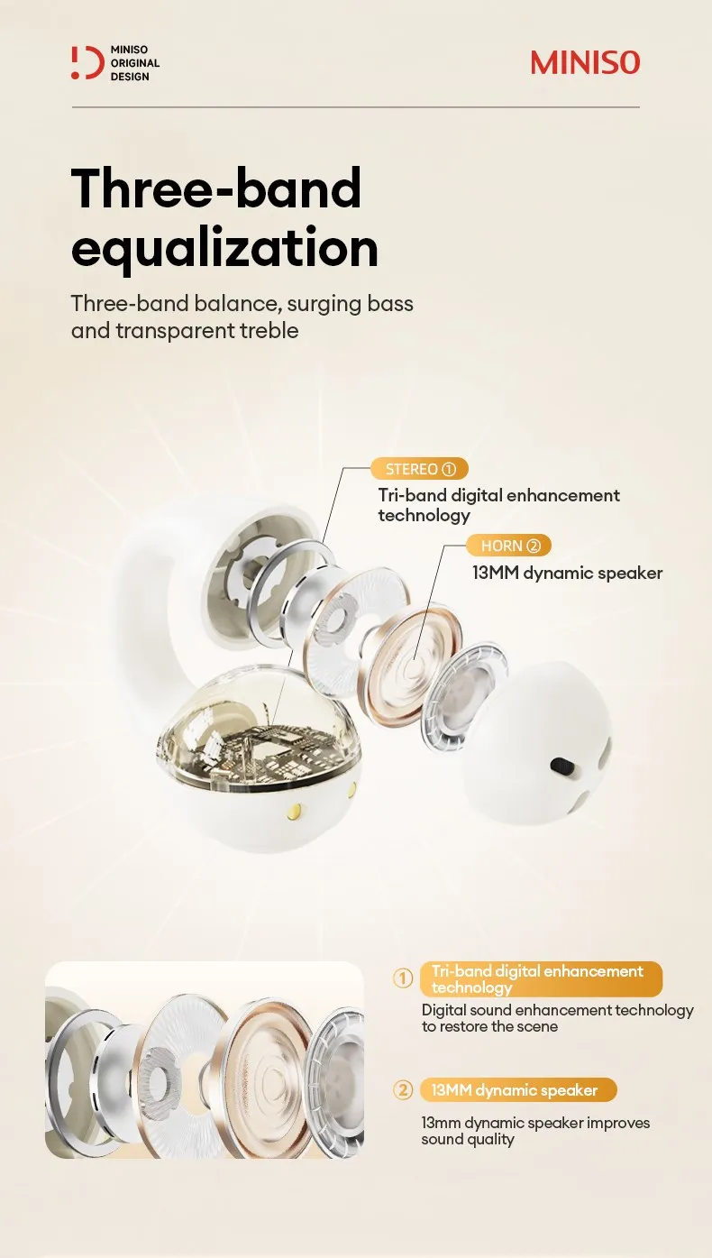 Original MINISO MCT09 Wireless Bluetooth V5.3 Earphones Touch Control Ear Clip Music Earbuds, Sport Running Headset with Mic