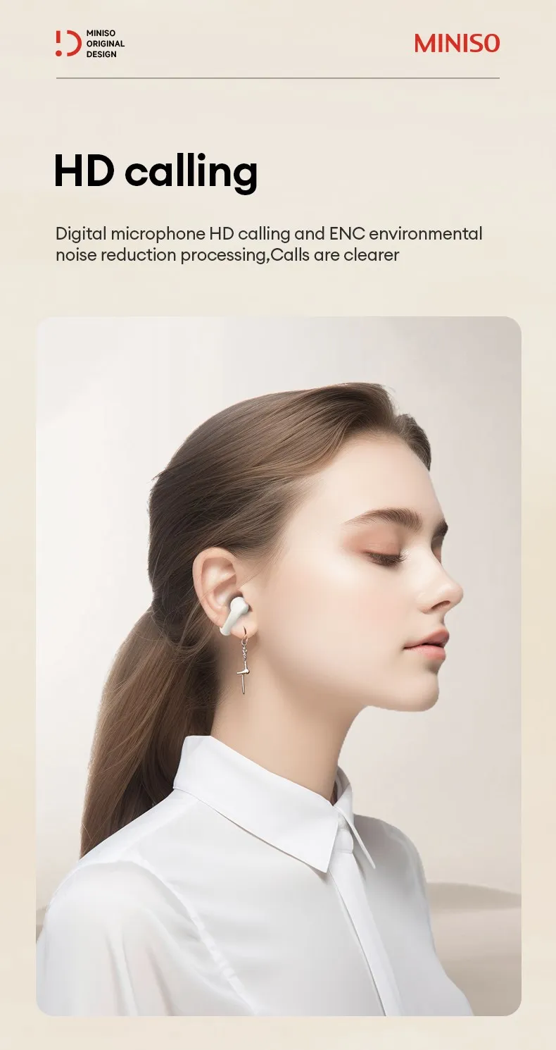 The MINISO MCT09 Wireless Earphones boast a sleek and ergonomic design that combines style with functionality. The compact, lightweight earbuds are designed to fit securely in your ears, thanks to the innovative ear clip design that helps prevent them from falling out during intense activities. The touch control panels on each earbud are seamlessly integrated into the design, allowing for intuitive operation without the need for physical buttons. The modern aesthetic and variety of colors make these earphones a stylish accessory for any outfit.