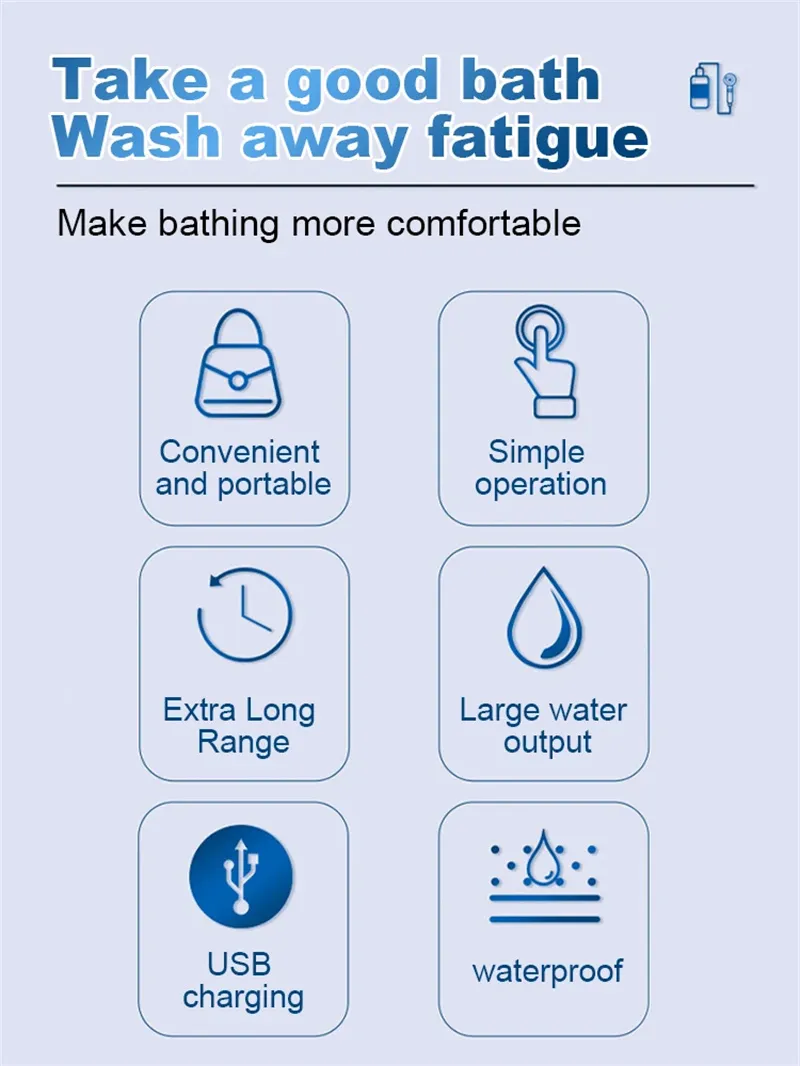 - 5000mAh Rechargeable Battery: Long-lasting power for multiple showers.