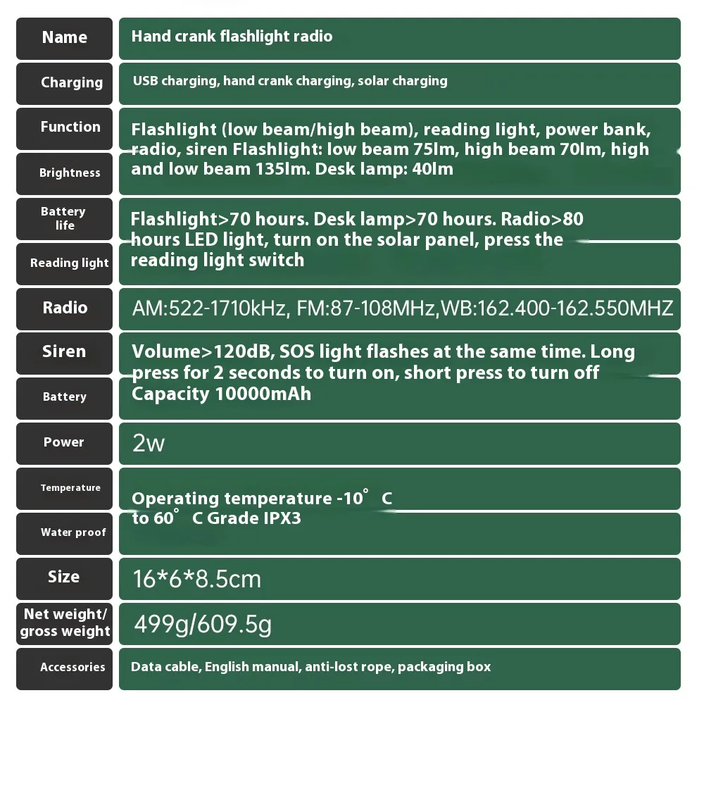 Prepare for any outdoor adventure or emergency situation with the Outdoor Emergency FMAM Solar Charging Lighting Portable Flashlight. Designed for durability and reliability, this flashlight is equipped with solar charging capabilities, FM/AM radio functionality, and powerful lighting—all in one compact device. Whether you're camping, hiking, or facing an unexpected power outage, this multifunctional tool ensures you stay safe and informed in any situation. The Outdoor Emergency FMAM Solar Charging Lighting Portable Flashlight is the perfect companion for anyone who enjoys outdoor activities in New Zealand’s unpredictable weather, offering peace of mind during adventures in the bush, at the beach, or on the road.