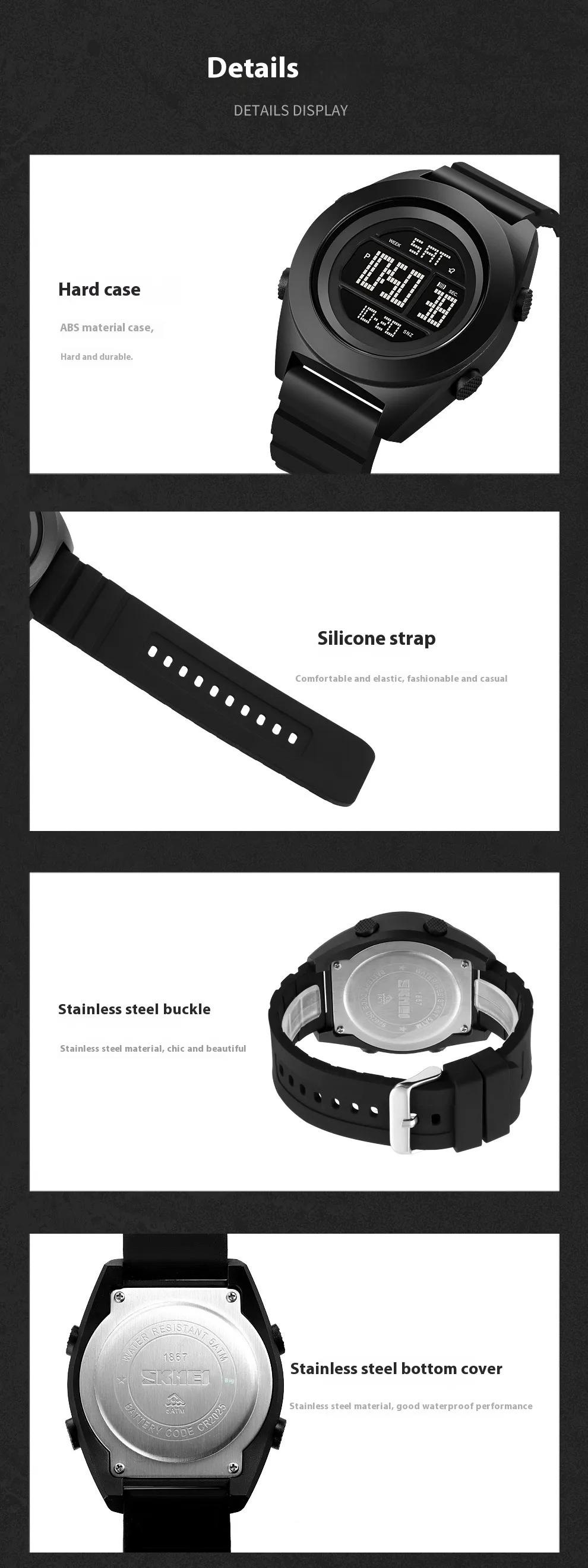 Material: ABS case, silicone strap, resin mirror, stainless steel back cover, stainless steel buckle