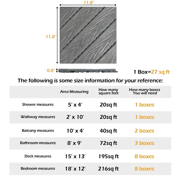 3. Single Tile Size: 11.8" x 11.8" x 0.8" / 30 x 30 x 2 cm