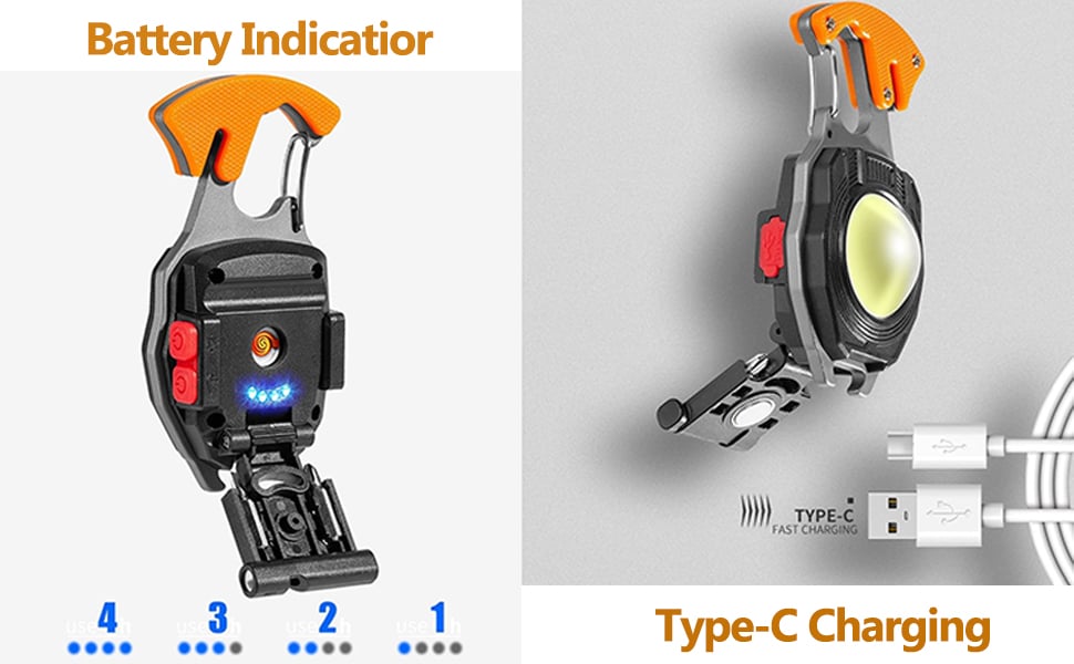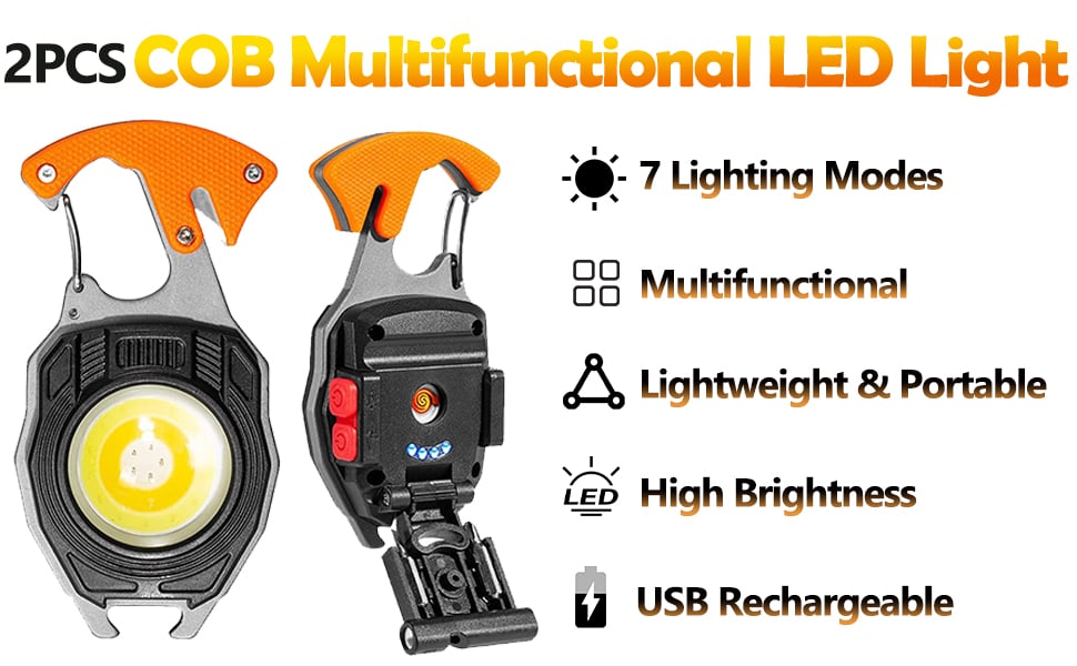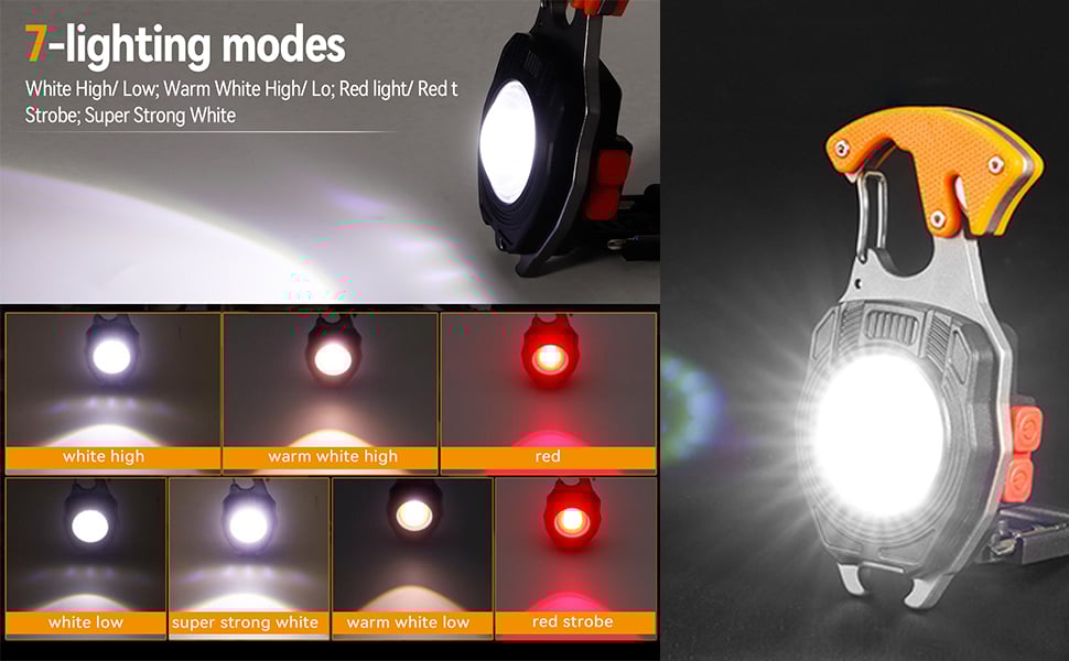 This COB light has 7 lighting modes: white light, white low light, white intense light, warm light, warm low light, red light and red flashing light. This keychain light can emit up to 1000 lumen light and offers a wider range of bright light, sufficient to illuminate your path.