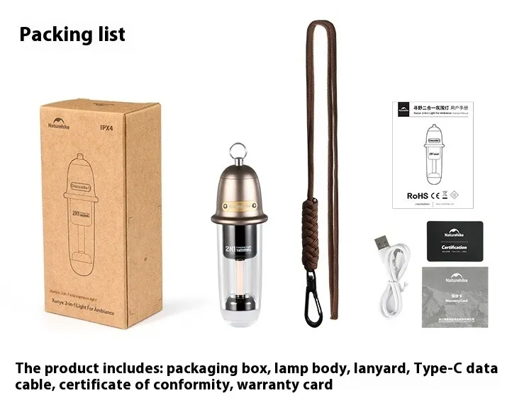 Packaging box, lamp body, hanging rope, Type-C data cable, certificate of conformity, warranty card