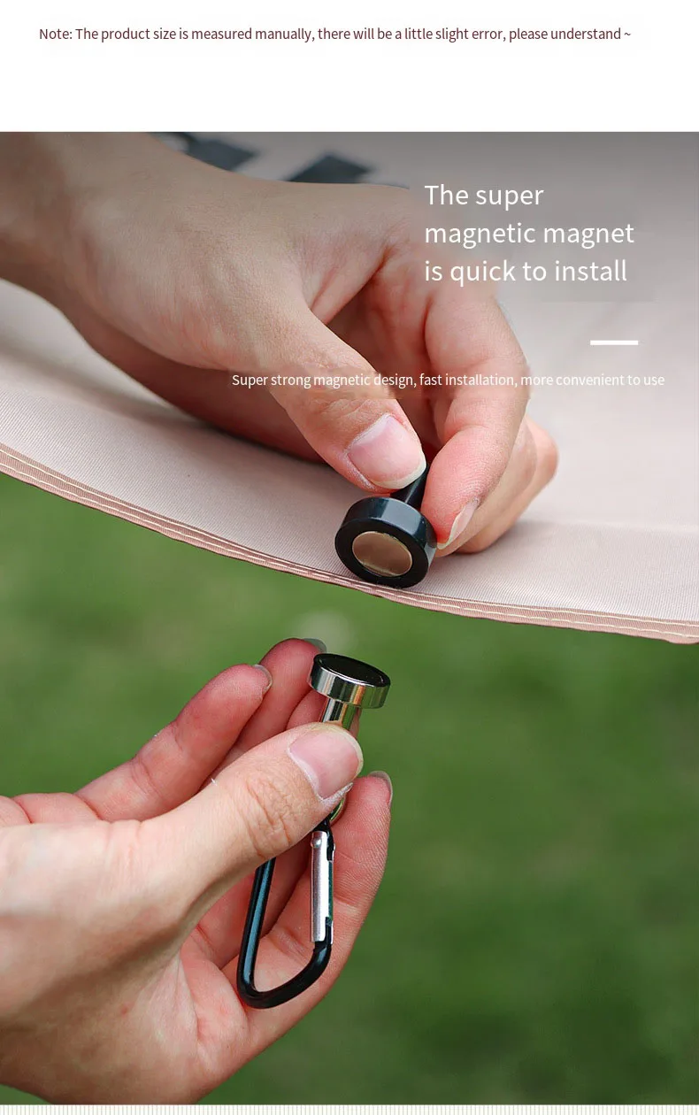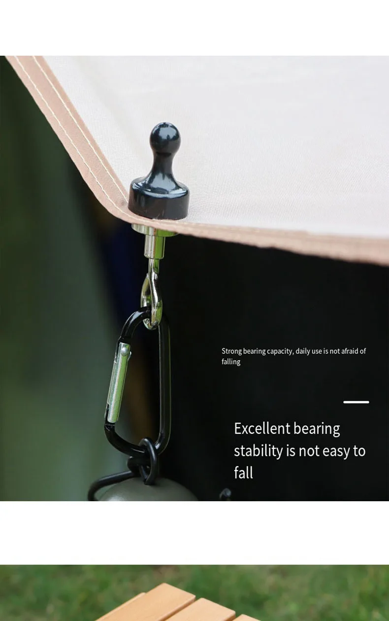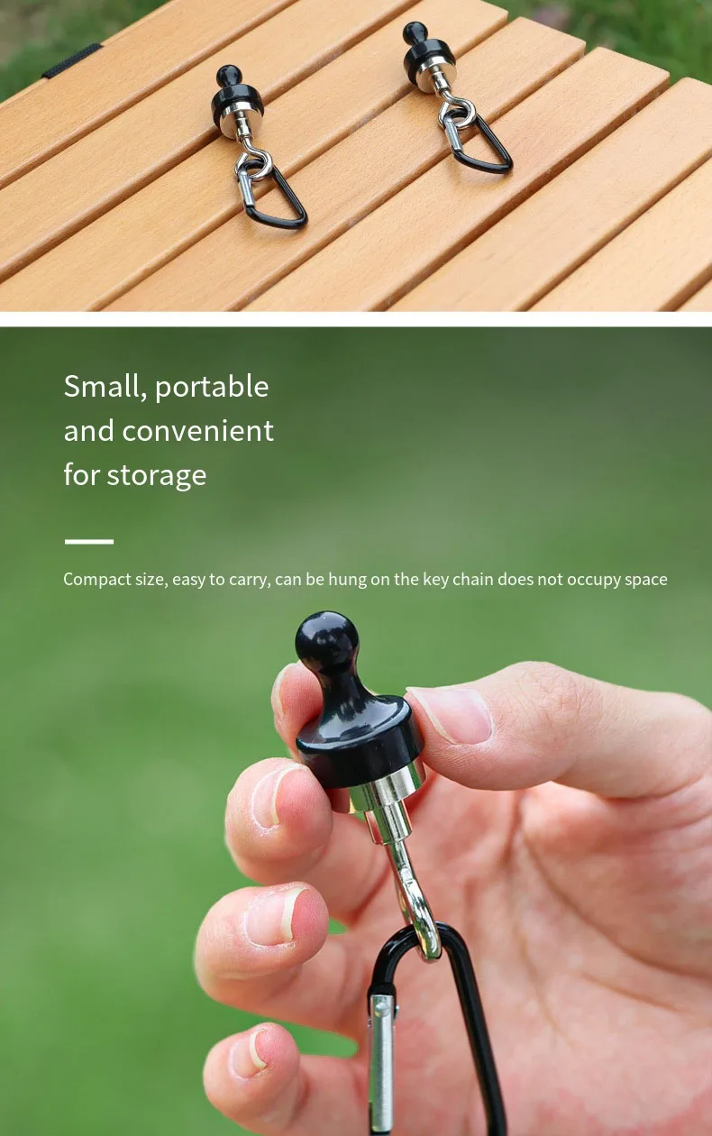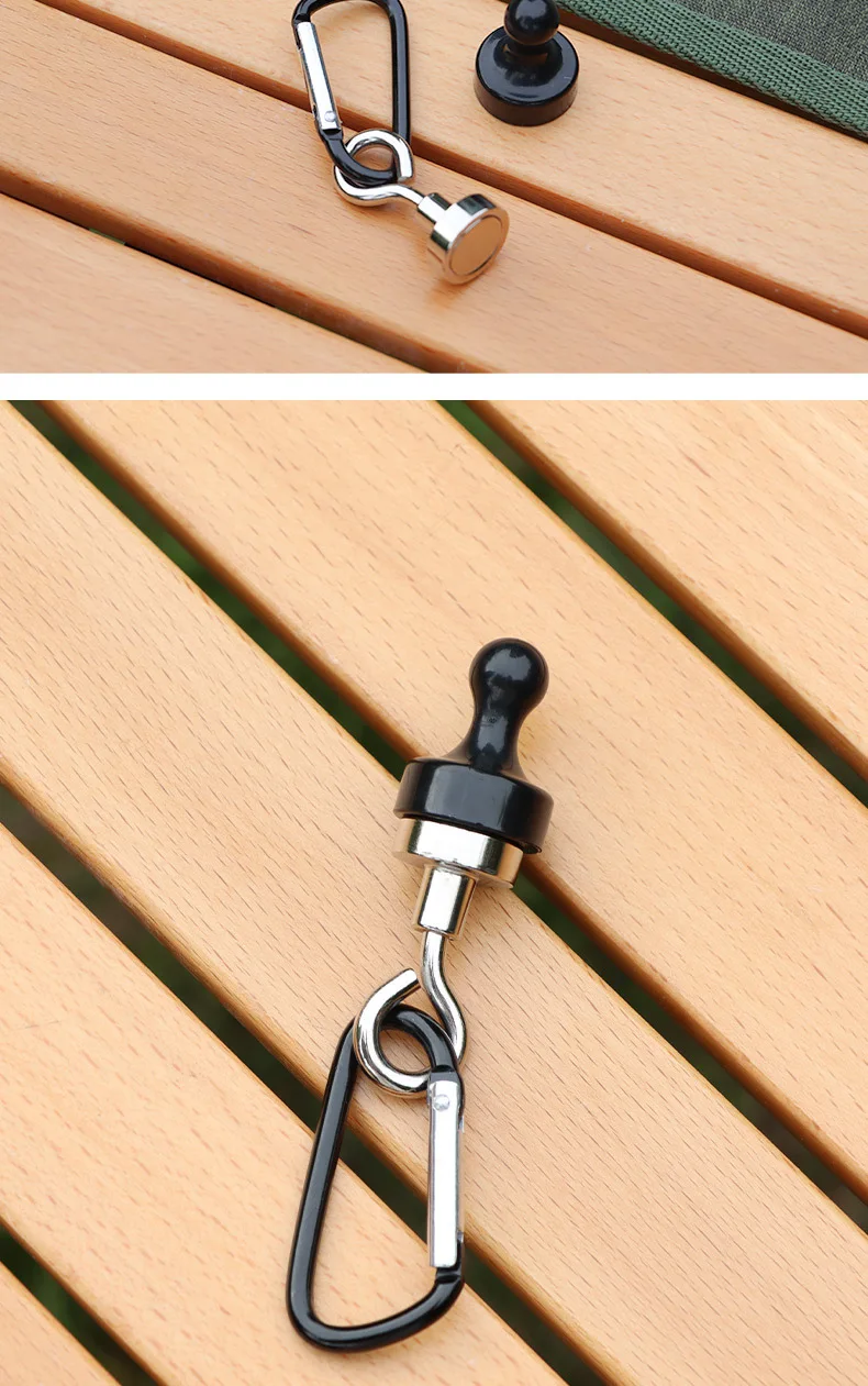 These magnet hooks are designed to provide reliable and versatile hanging solutions for outdoor activities. The powerful magnets can attach securely to any metal surface, making them ideal for hanging camping lights, canopies, and other equipment. The hooks can support substantial weight, ensuring your gear stays in place. The mountaineering buckles offer additional functionality, allowing you to secure tents, ropes, and other items with ease. These hooks are perfect for camping, mountaineering, fishing, and other outdoor activities where organization and efficiency are crucial.