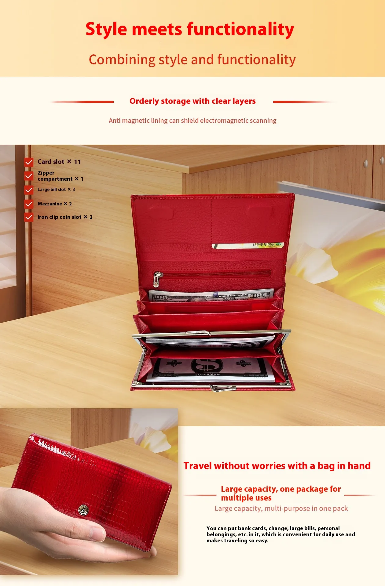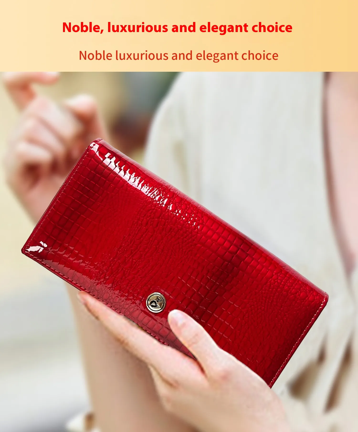 Our Patent Leather Crocodile Pattern Women's Wallet with High-Grade Red Lock Clutch is a testament to sophisticated style and security. This stunning accessory is designed for the modern woman in New Zealand who values both fashion and functionality. Its vibrant red color and distinctive crocodile pattern make it a standout piece, perfect for making a bold statement.