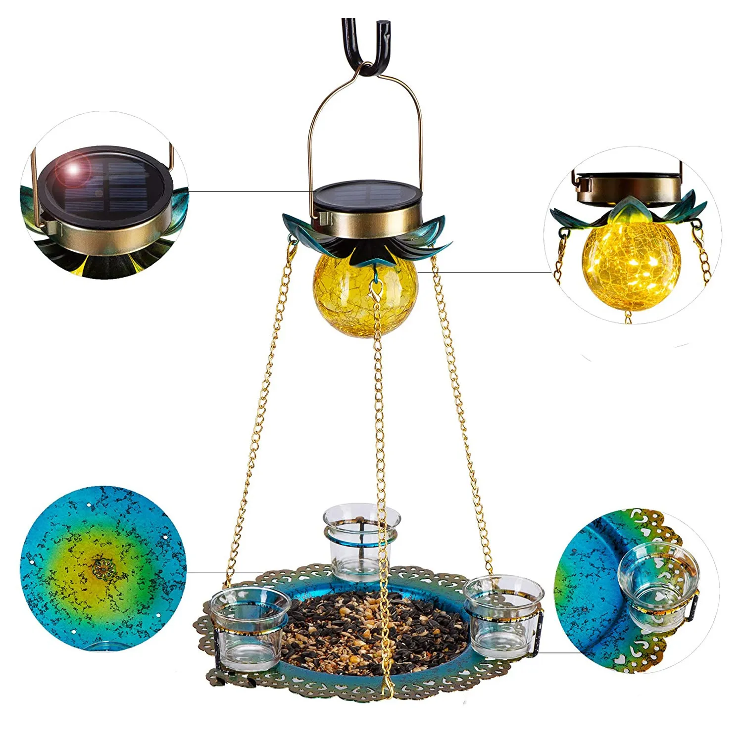 For an added touch of magic, decorative peacock bird baths with integrated solar lights provide a beautiful illumination in the evening. These bird baths feature built-in solar panels that charge during the day, lighting up the peacock design at night. Solar-powered bird baths are perfect for creating a mesmerizing ambiance in your garden, allowing you to enjoy the beauty of the bird bath day and night.