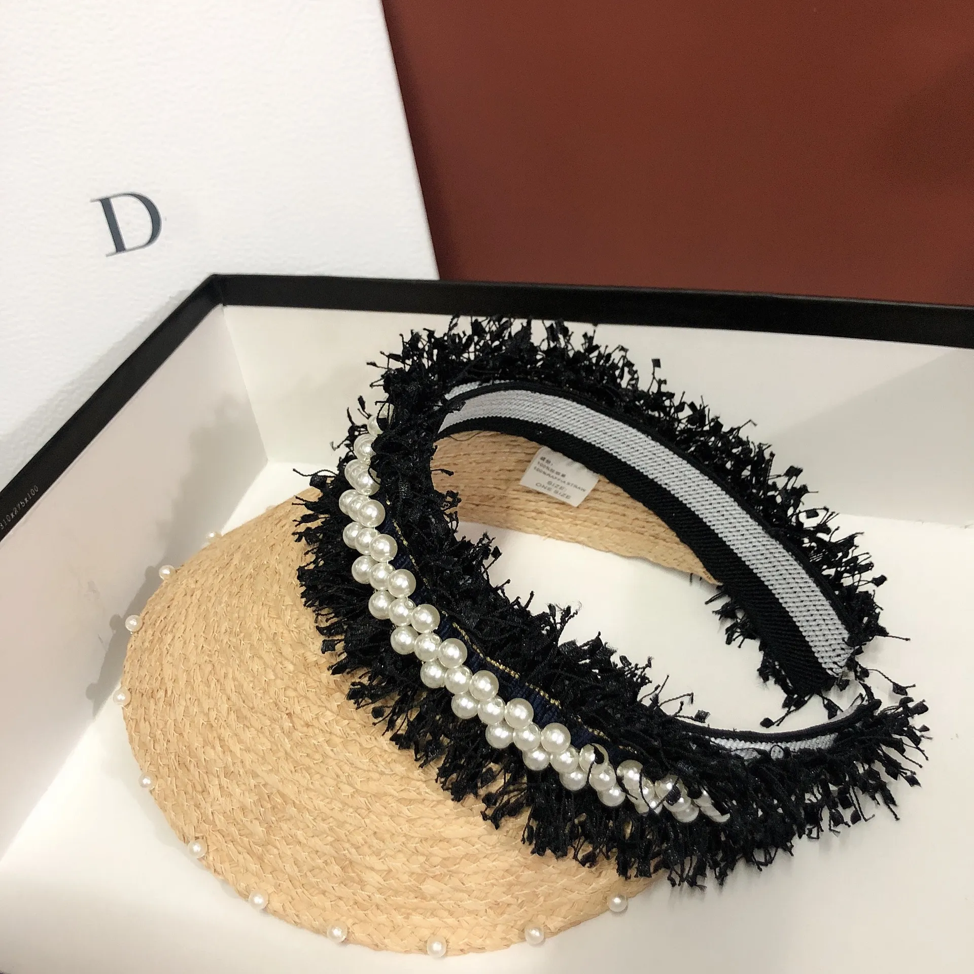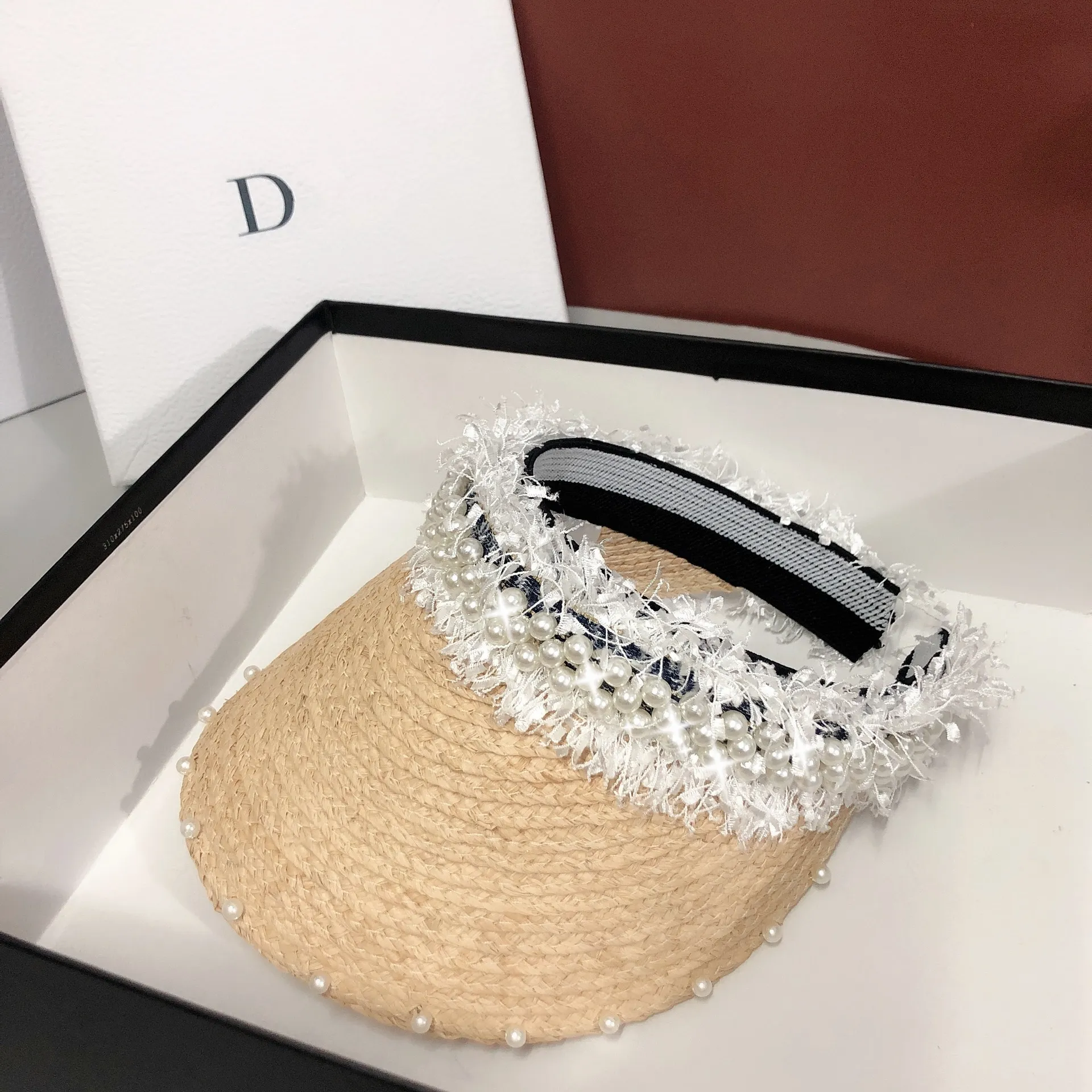 Crafted from high-quality straw, the Pearl Straw Empty Top Hat features a unique "empty top" design, offering excellent ventilation to keep your head cool during hot weather. The hat is adorned with a band of faux pearls, adding a luxurious touch to its appearance. Its wide brim provides ample shade, protecting your face and neck from harmful UV rays.