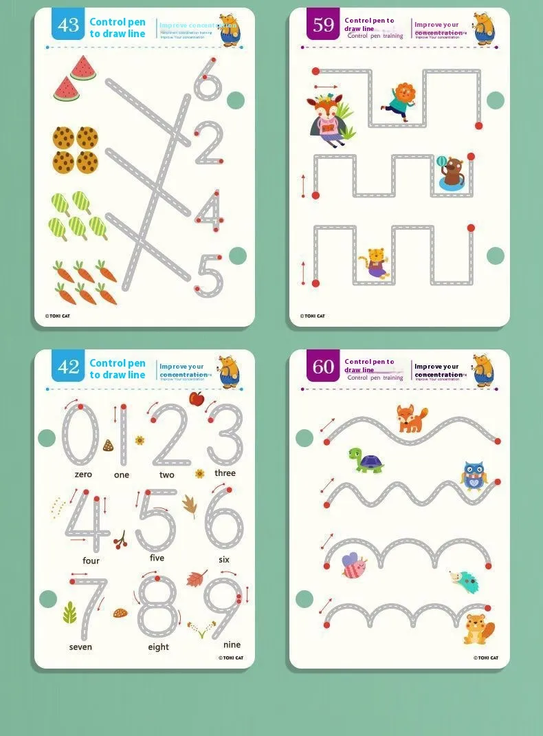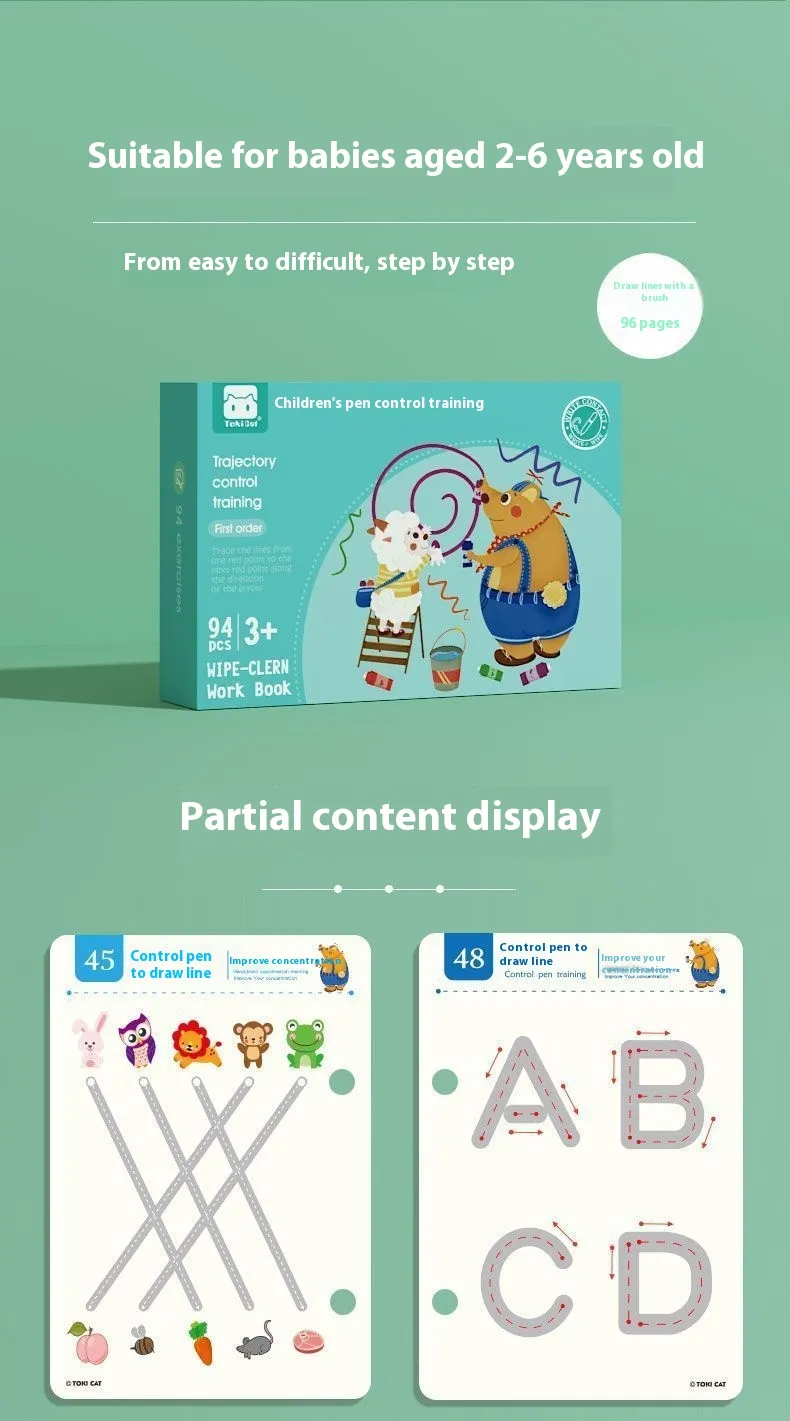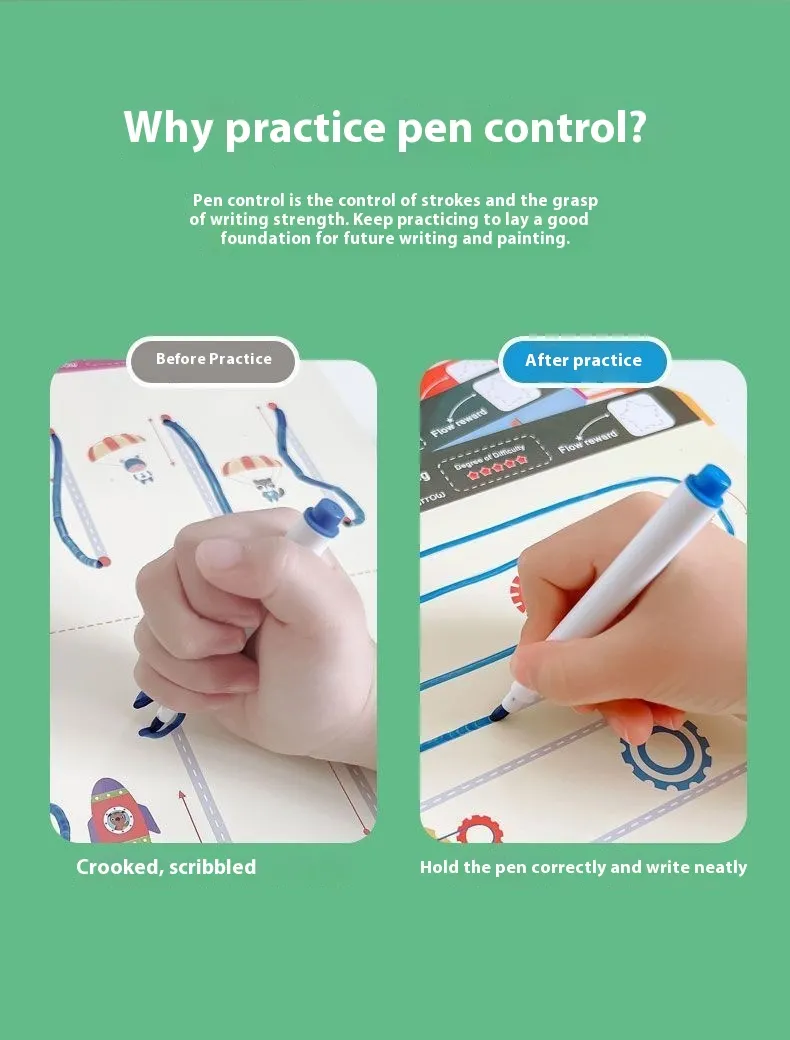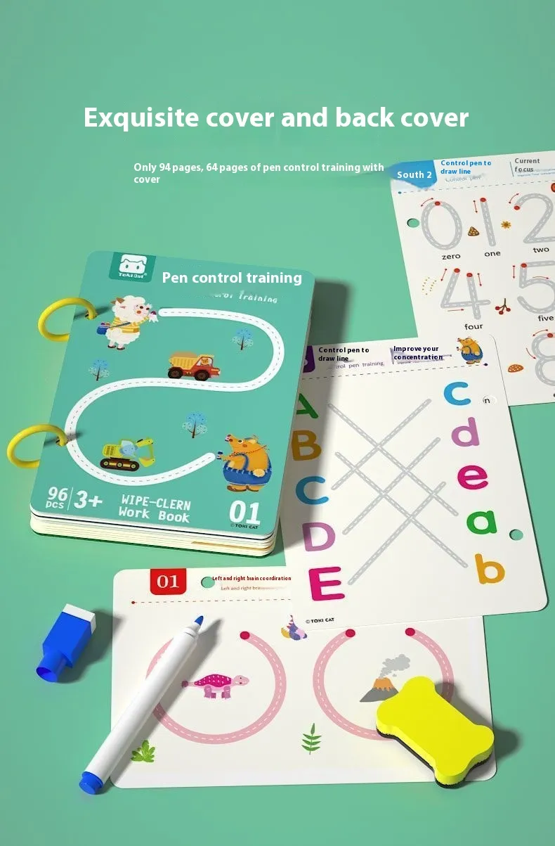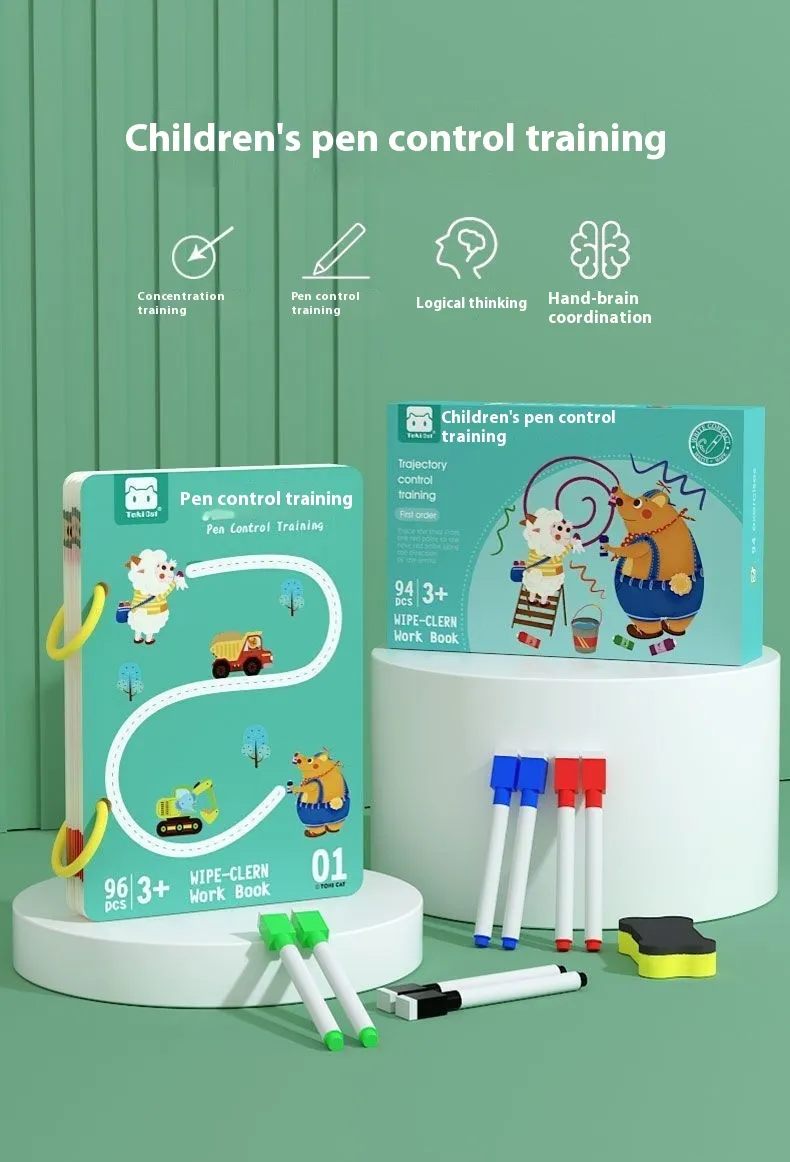 Pen Control Training 64 pages+5pcs * Pen+1pcs * Wiping Board/Drawing Point Connection 49 pages+5pcs * Pen+1pcs * Wiping Board/Left and Right Brain Development 32 pages+5pcs * Pen+1pcs * Wiping Board