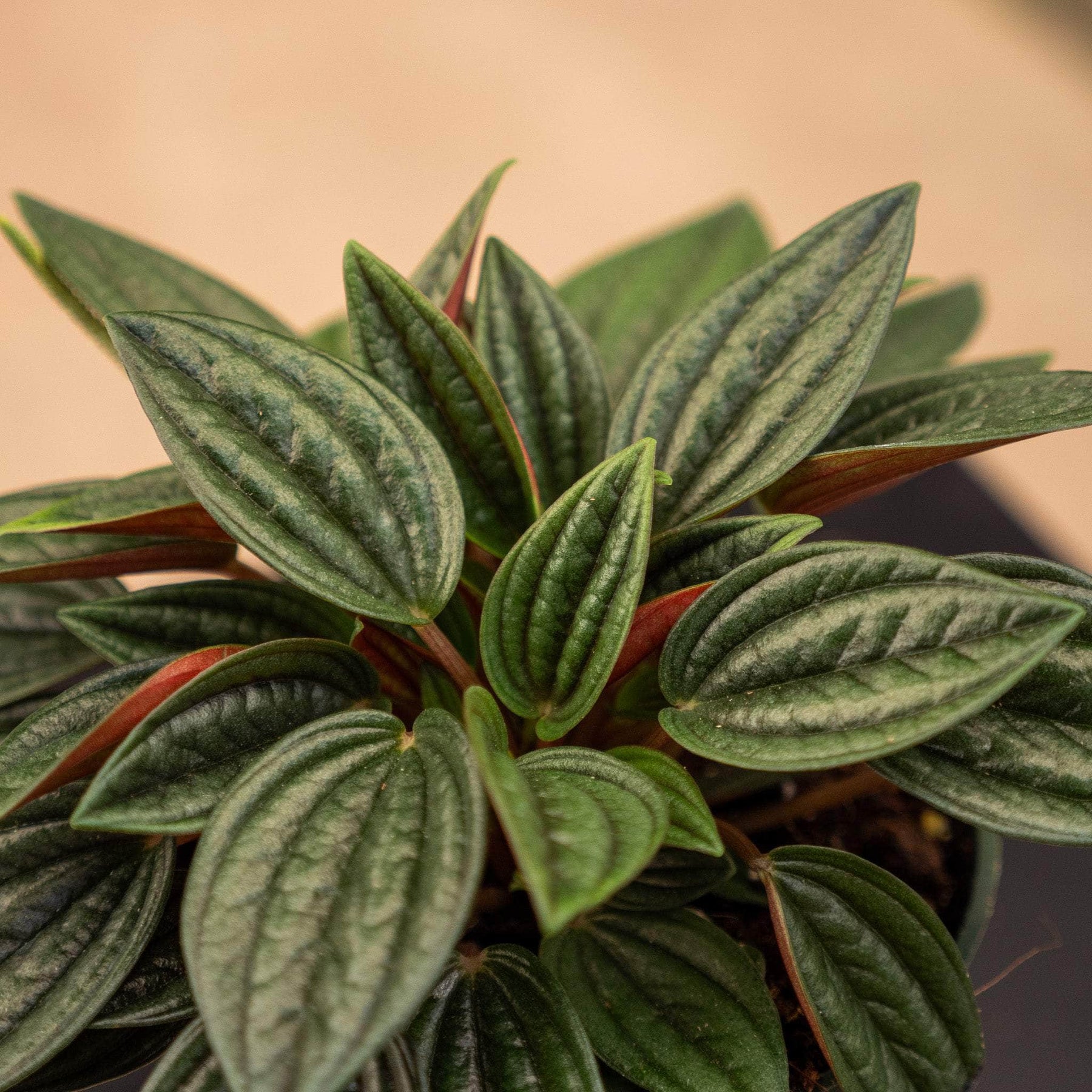 Peperomia 'Eden Rosso' features an intriguing combination of vibrant colors and textures that make it a standout addition to any plant collection. The top side of the leaves is a rich, deep green with pronounced veining that creates a beautifully textured surface. In contrast, the underside of the leaves reveals a vivid red, adding a surprising splash of color that is revealed when the leaves catch the light or are gently moved. This dual-color foliage is arranged in a neat, compact rosette, making it an ideal plant for small spaces such as desktops, shelves, or windowsills.