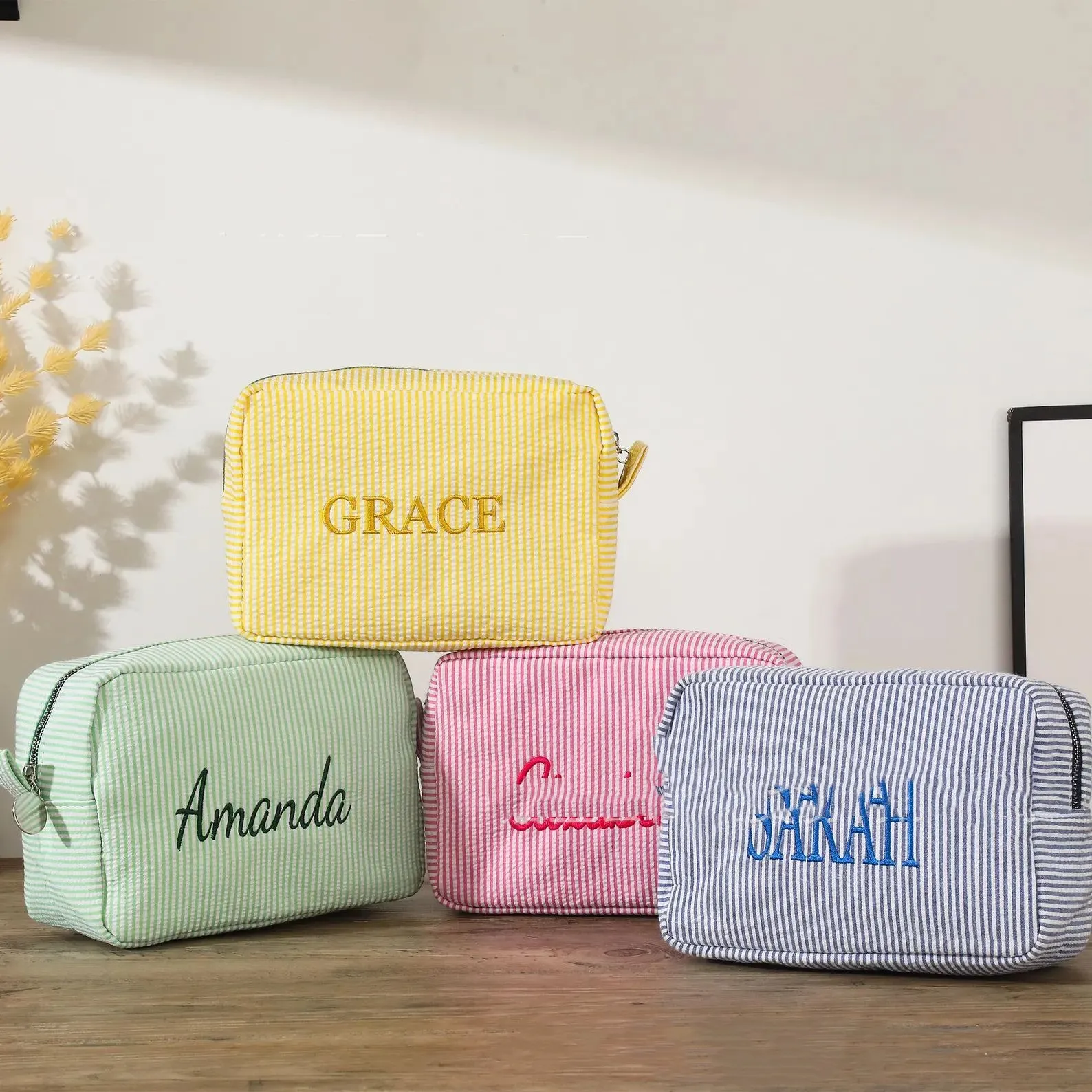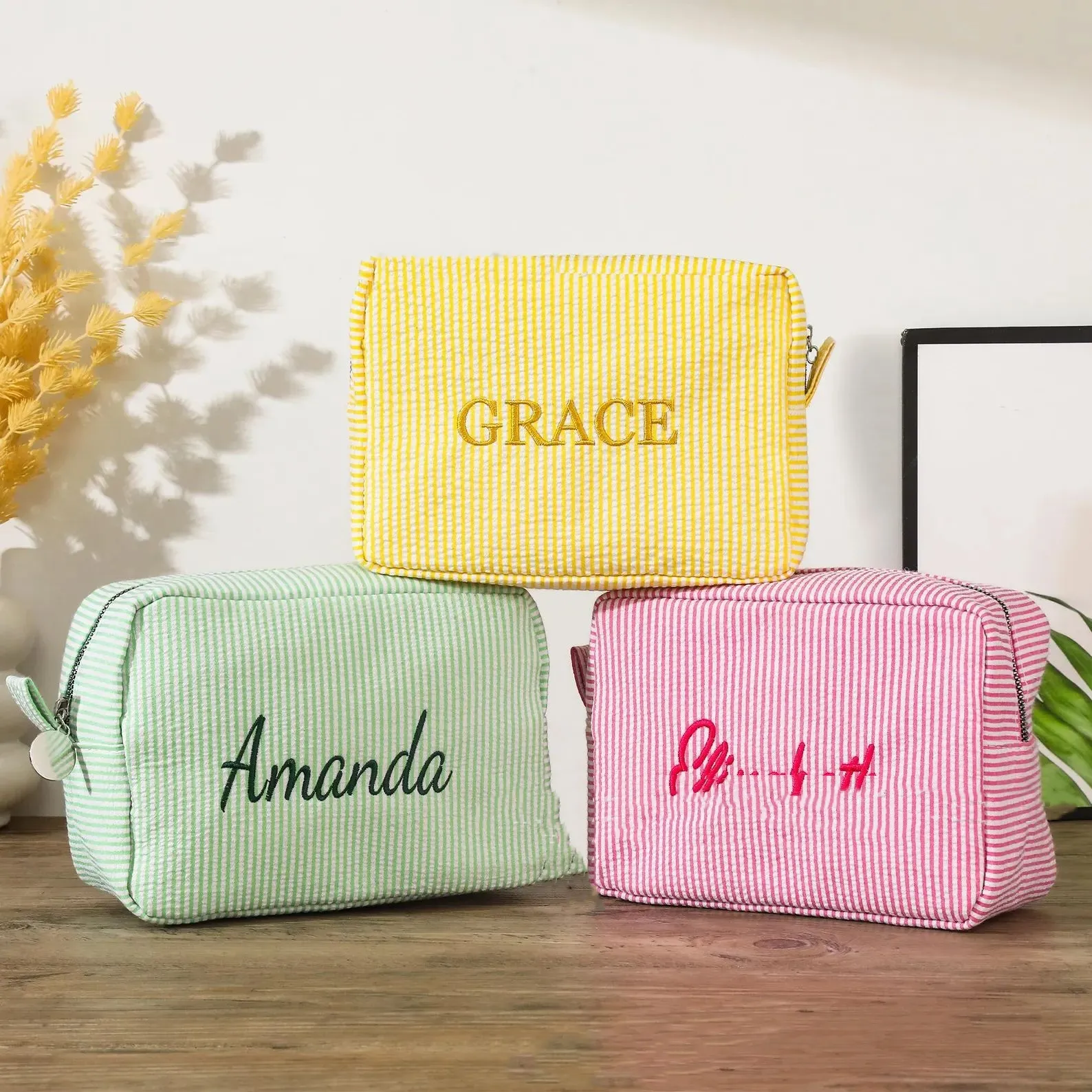 Personalized Embroidered Striped Bubble Yarn Makeup Bag – Stylish and Customizable Storage for Your Beauty Essentials