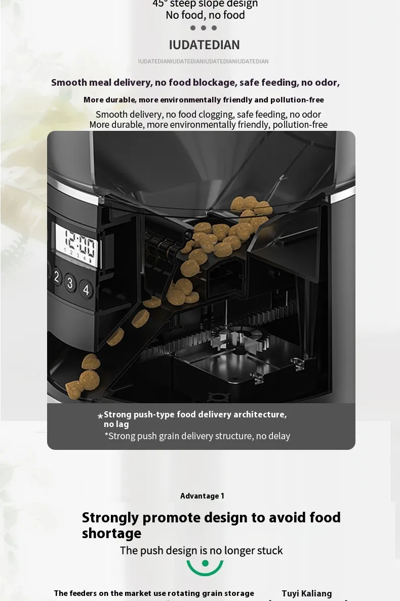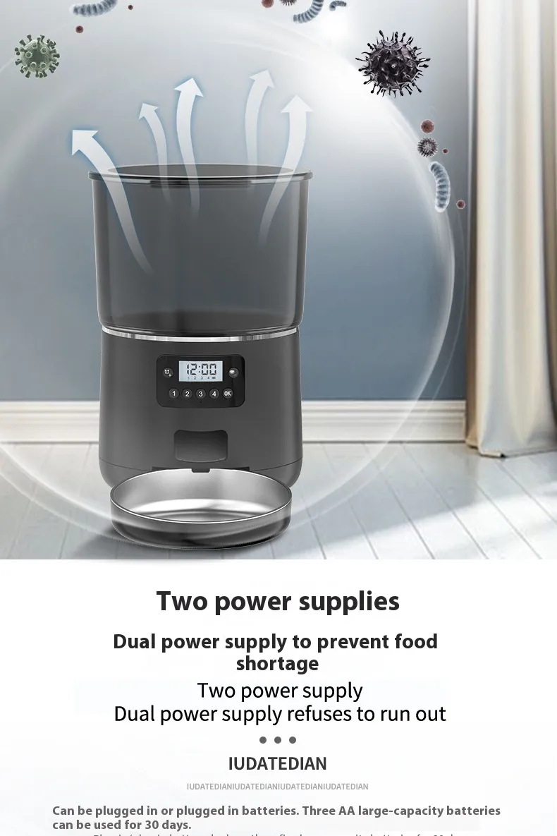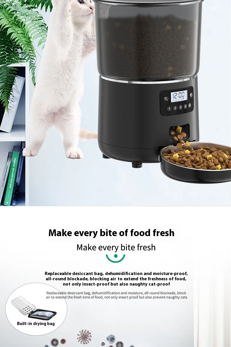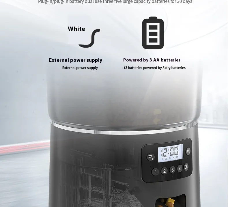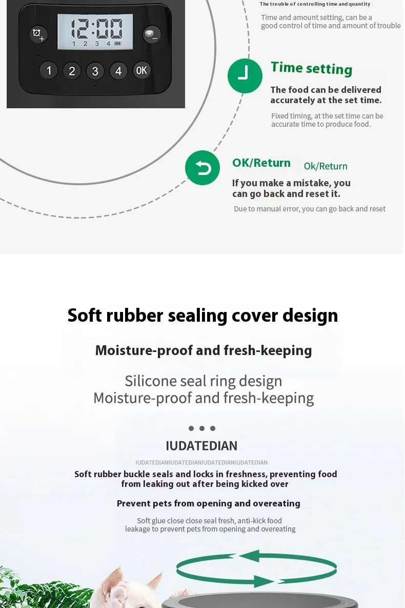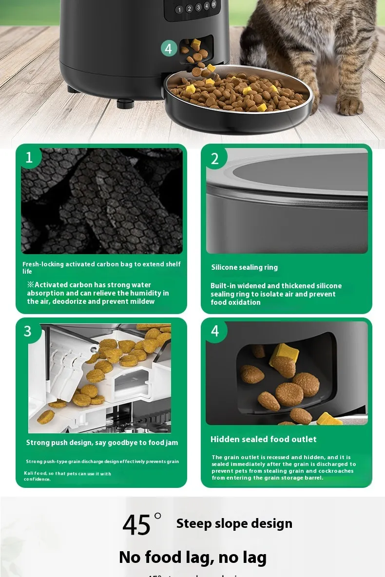 Built with a sealed food storage container, it keeps dry food fresh and crunchy, and the dual power supply (USB and battery backup) ensures continuous operation even during power outages. Plus, with the integrated voice recording feature, you can leave a comforting message that plays during mealtime—so your pet never feels alone.