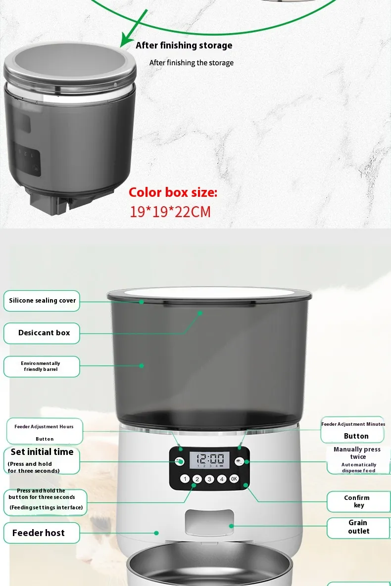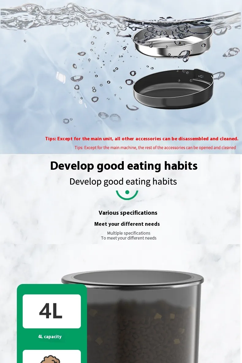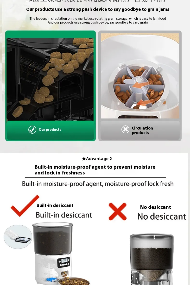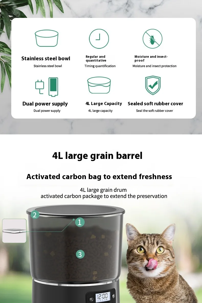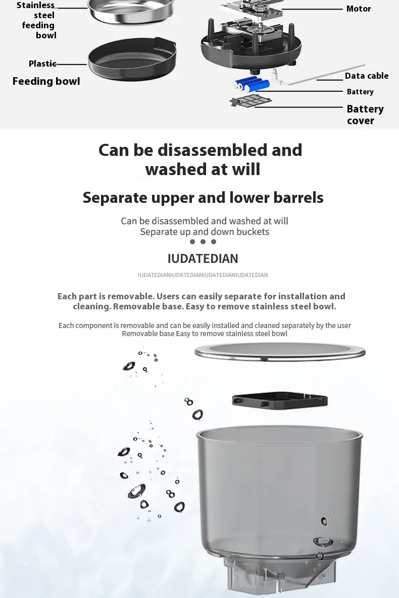 Built with a sealed food storage container, it keeps dry food fresh and crunchy, and the dual power supply (USB and battery backup) ensures continuous operation even during power outages. Plus, with the integrated voice recording feature, you can leave a comforting message that plays during mealtime—so your pet never feels alone.