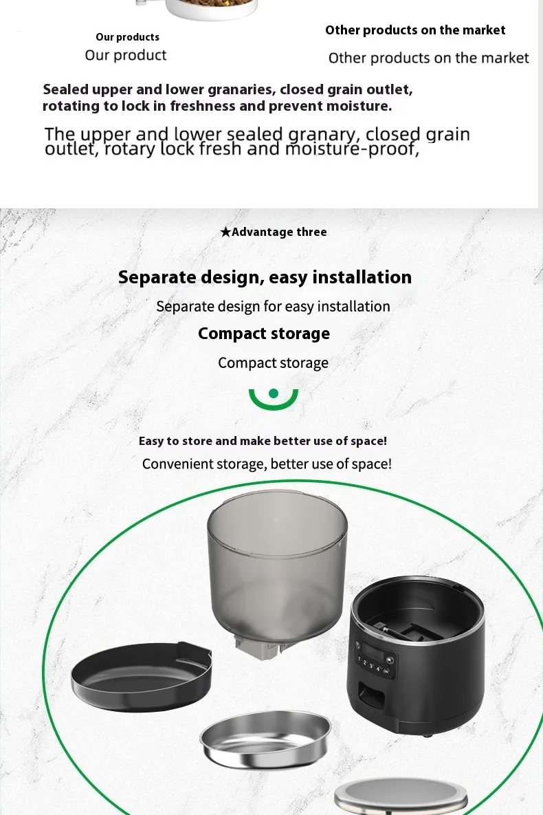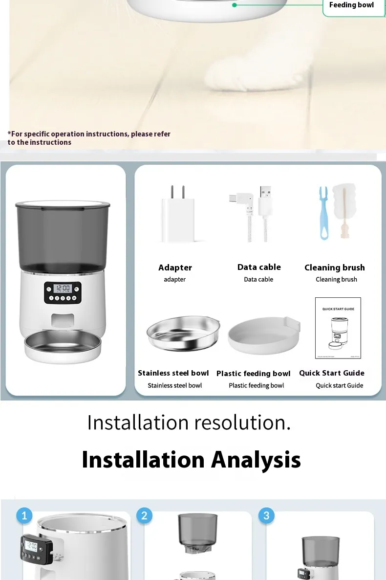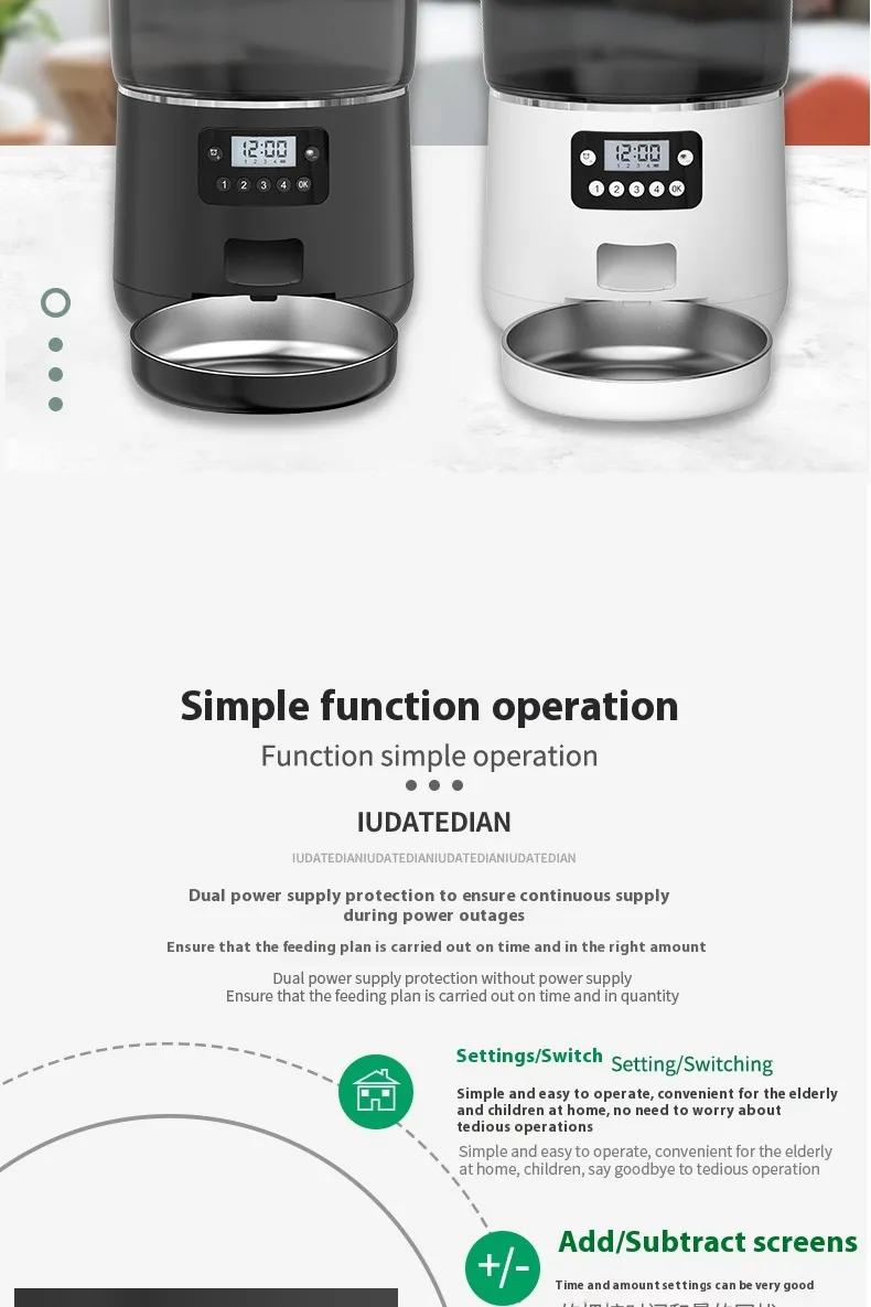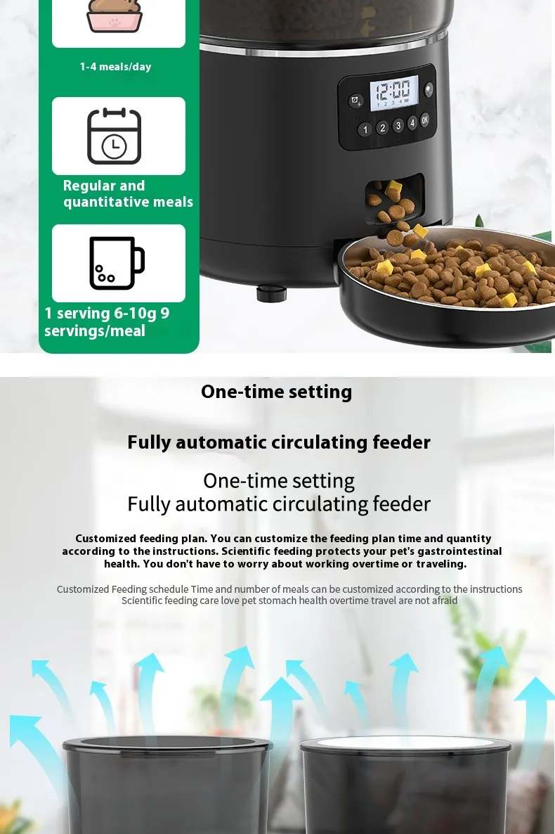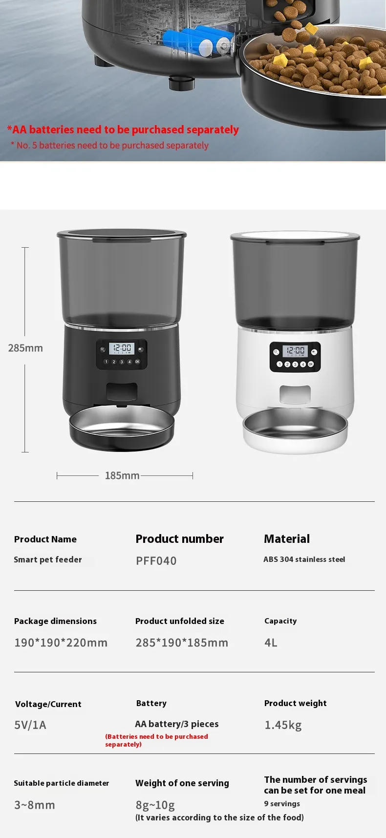 Built with a sealed food storage container, it keeps dry food fresh and crunchy, and the dual power supply (USB and battery backup) ensures continuous operation even during power outages. Plus, with the integrated voice recording feature, you can leave a comforting message that plays during mealtime—so your pet never feels alone.