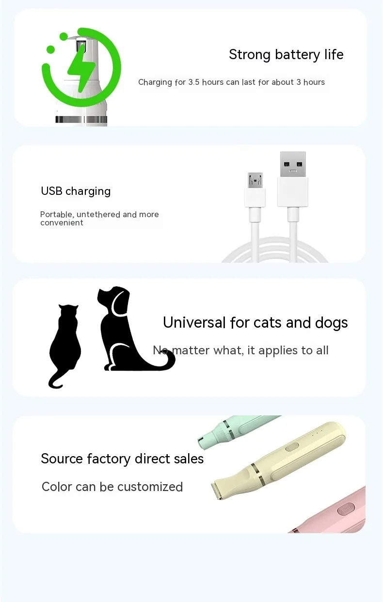 From gentle trimming to detailed grooming, the Pet Shaver 4 in 1 Suit Electric is designed to handle all the grooming tasks for your dog, cat, or other pets with ease. Its ergonomic design and user-friendly features ensure that you can groom your pet at home or on the go, saving time and money while ensuring your pet stays comfortable and healthy.