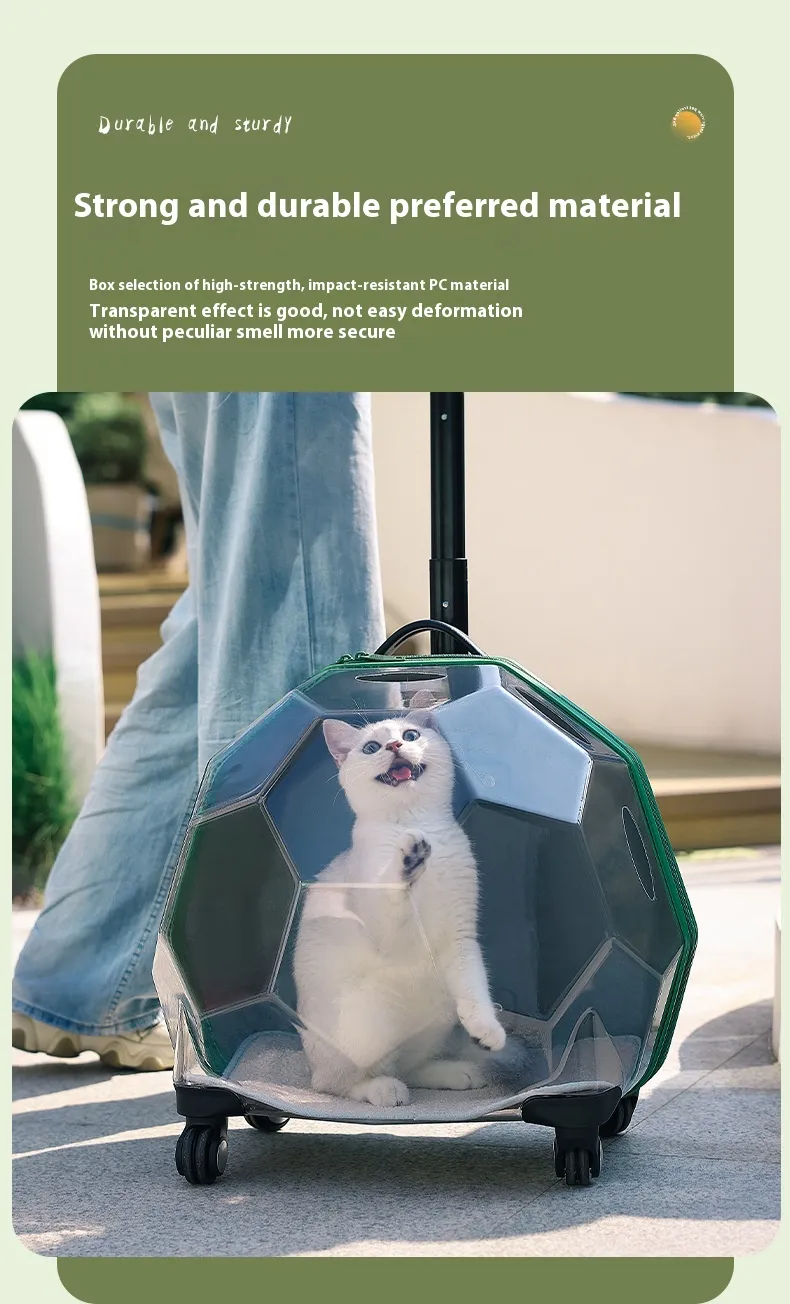 - Crafted from high-quality, durable materials, this pet trolley space capsule is designed to withstand the wear and tear of regular travel. The strong polycarbonate shell ensures maximum protection against bumps and impacts, keeping your pet safe and secure at all times.