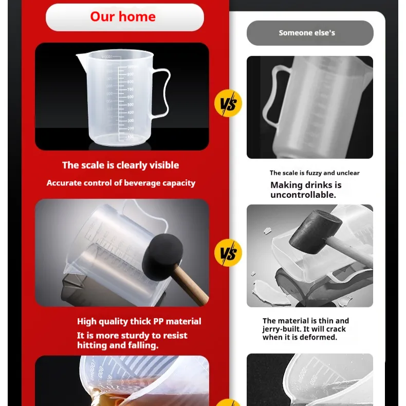 The Plastic Measuring Cup stands out for its combination of durability, precision, and ease of use. Unlike glass measuring cups that can be heavy and prone to breaking, this plastic version is lightweight yet sturdy, making it perfect for everyday use in the kitchen. The clear, easy-to-read measurements and ergonomic design make it suitable for both novice and expert cooks, ensuring that your recipes turn out just as you intended. It’s the perfect companion for anyone who wants reliable and convenient kitchen tools.