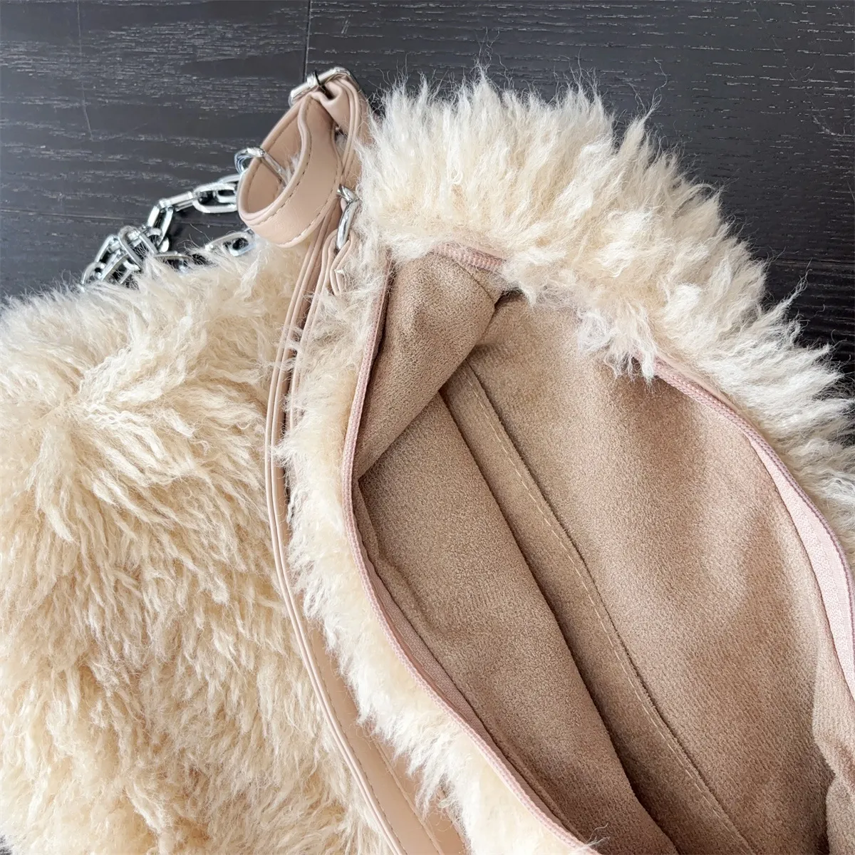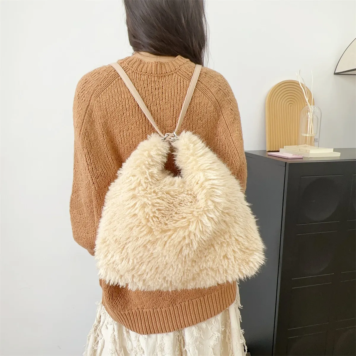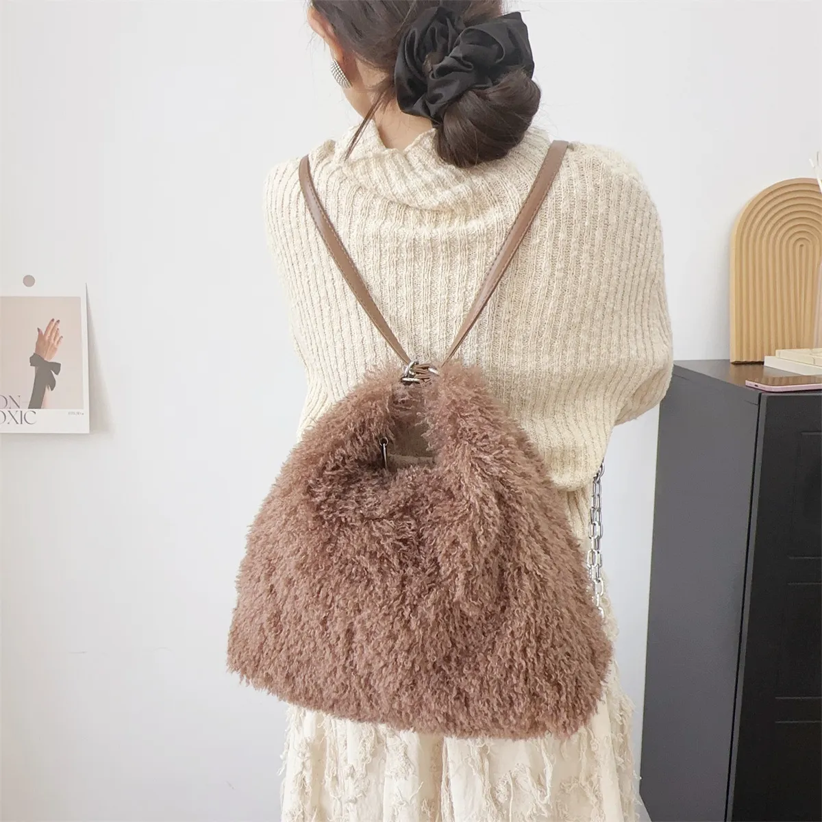 "I love how versatile this bag is. The plush fabric feels luxurious, and the shoulder strap is so convenient."