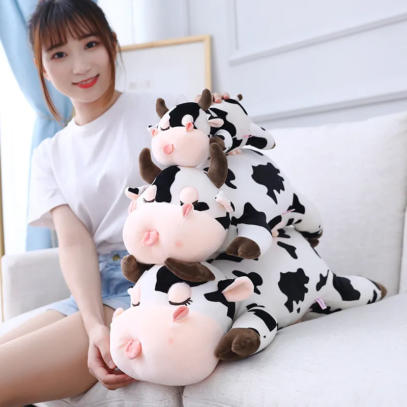 A: The plush cow is available in 30cm, 50cm, 80cm, and 100cm+ sizes.