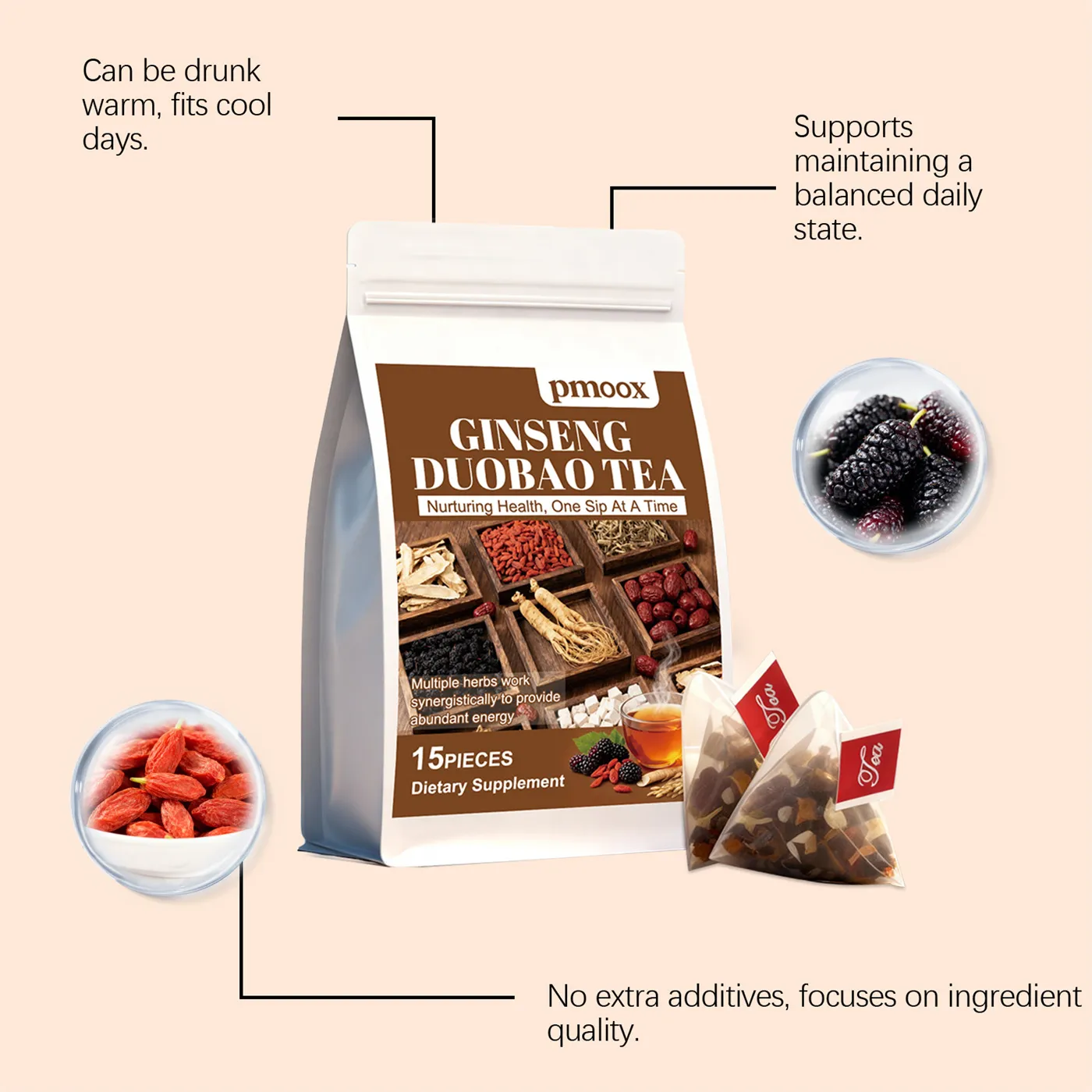 pmoox Ginseng Duobao Tea is a powerful herbal blend designed to enhance energy, promote mental clarity, and support overall health. With its combination of ginseng, goji berries, and other carefully selected herbs, this tea helps nourish the body and support vitality, stamina, and immune function.