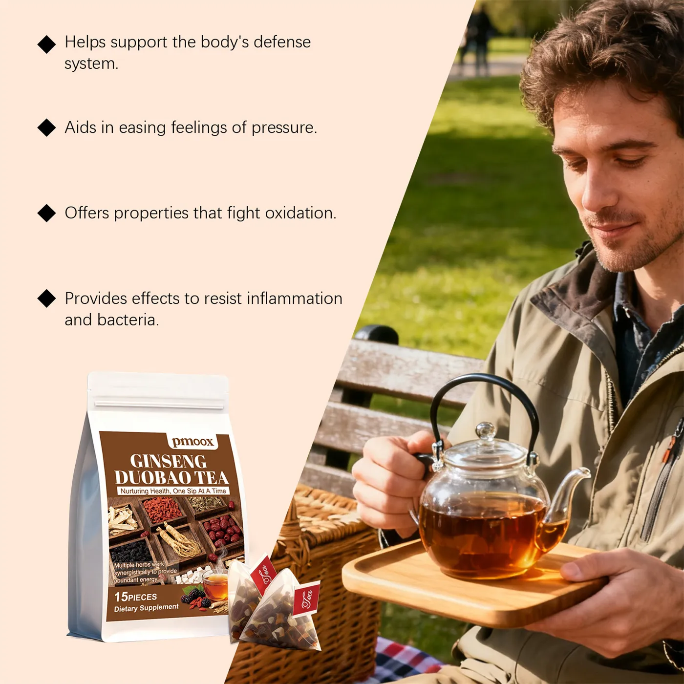 Perfect for those in need of a natural way to support energy and immune health, pmoox Ginseng Duobao Tea is your go-to solution for revitalizing your body and mind in one delicious cup.