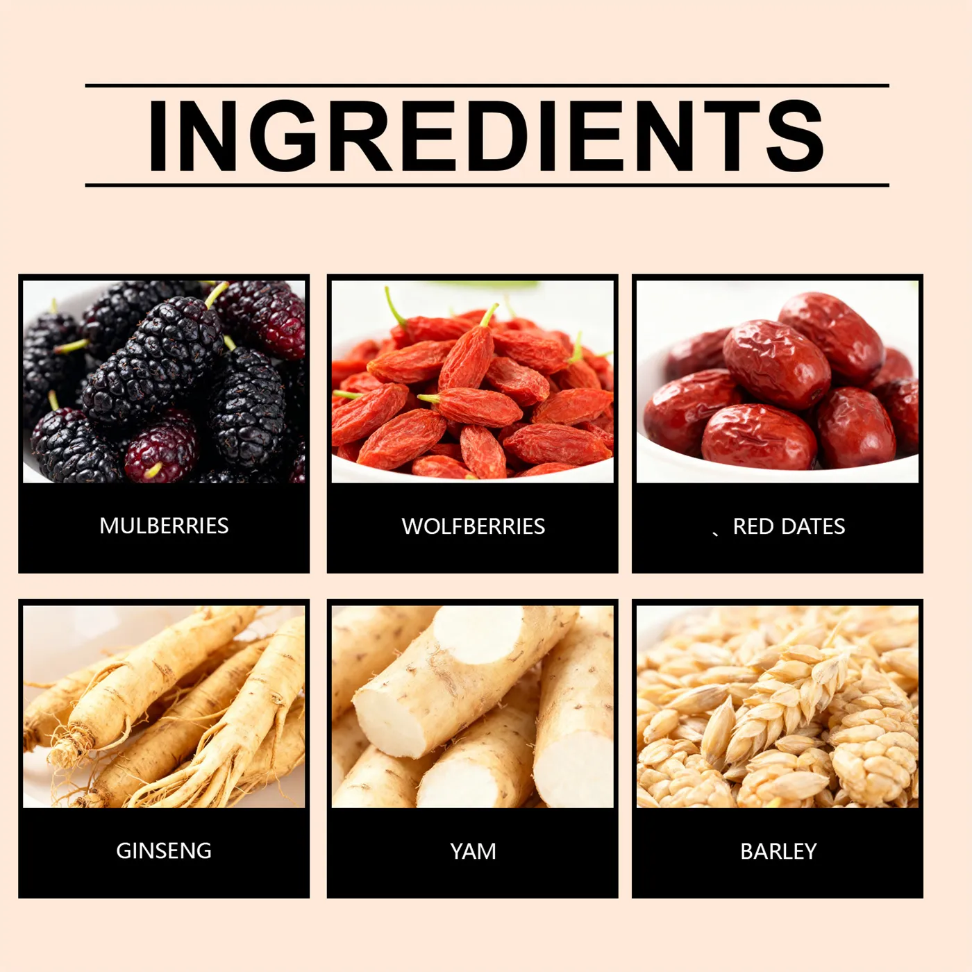 Ingredients: Mulberry, Lycium barbarum, Jujube, Ginseng, Yam and Barley.