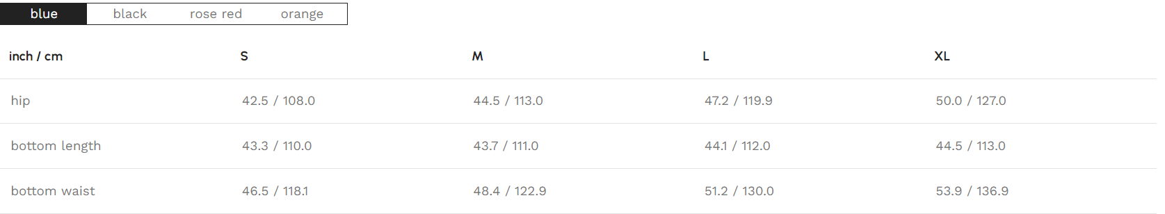 | bottom length | 43.3 / 110.0 | 43.7 / 111.0 | 44.1 / 112.0 | 44.5 / 113.0 |