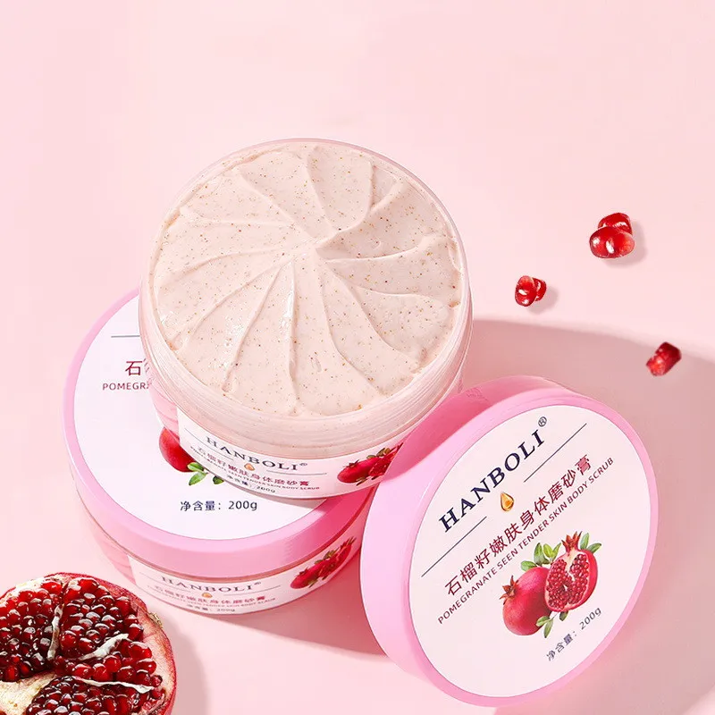 - Preparation: Wet your skin in the shower or bath. Scoop a generous amount of the Pomegranate Seed Skin Rejuvenation Body Scrub into your hand.