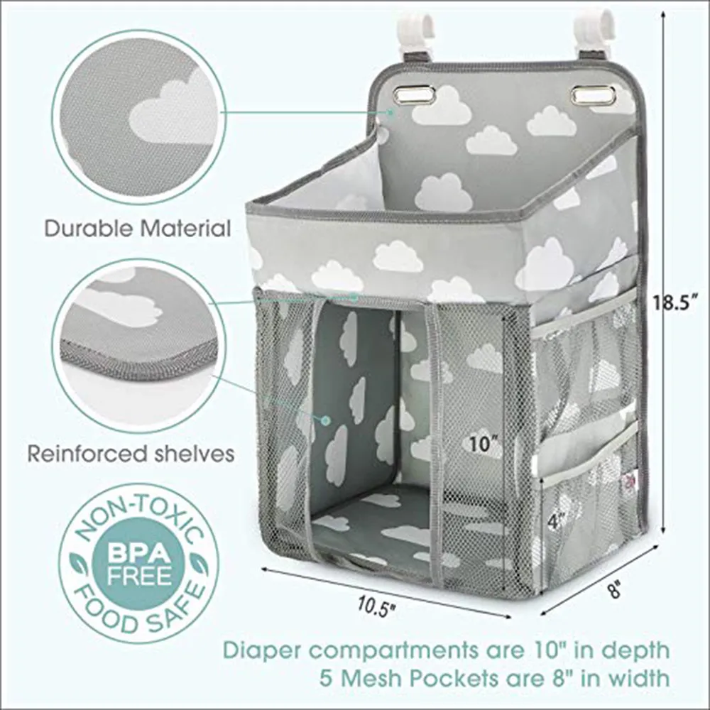 Equipped with adjustable straps or hooks, the organizer securely attaches to cribs, beds, or changing tables, ensuring stability and easy access.