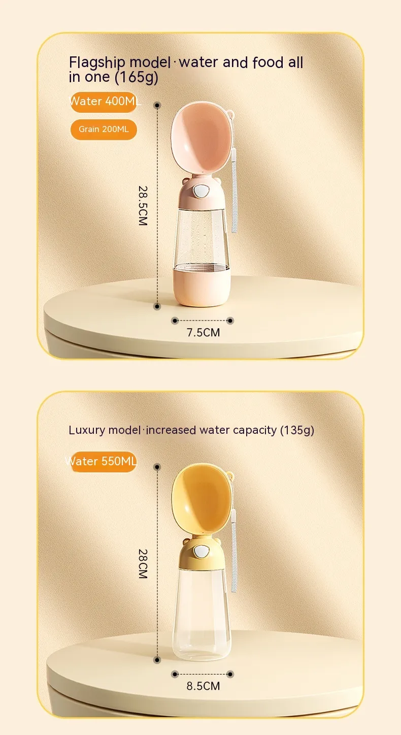 On the other side of the bottle, the food container holds your pet’s favorite treats or kibble, providing easy access when it’s time for a snack or meal. The attached feeder bowl is designed to be portable and easy to use, giving your pet a comfortable way to eat and drink while outdoors. Whether you’re hiking, traveling, or just taking a stroll, this portable pet bottle and feeder ensures that your furry companion always has fresh water and food available.