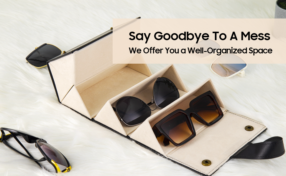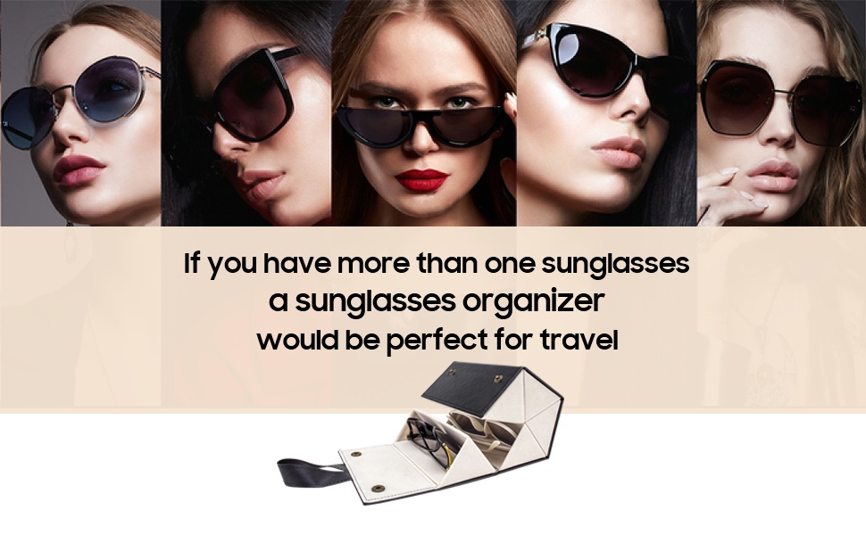 - Travel sunglasses organizer is made of PU leather, sturdy enough, never scratch your lens. Whether it's hanging in the wardrobe at home or folding up on the vanity table, it always meet your collection needs in an perfectly organized style.