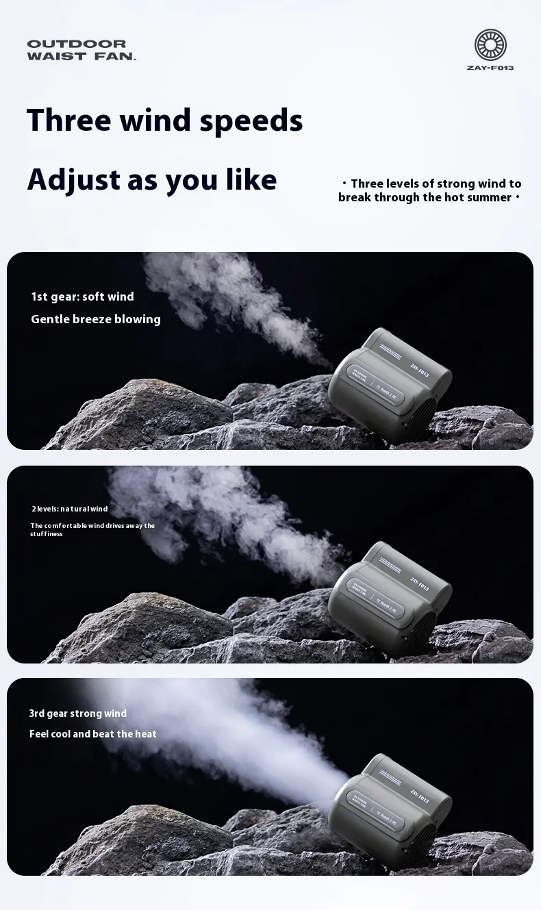 2. Adjustable Airflow: With three adjustable speeds, the waist fan lets you personalize your air flow and stay hands-free for unrestricted movement during outdoor activities.