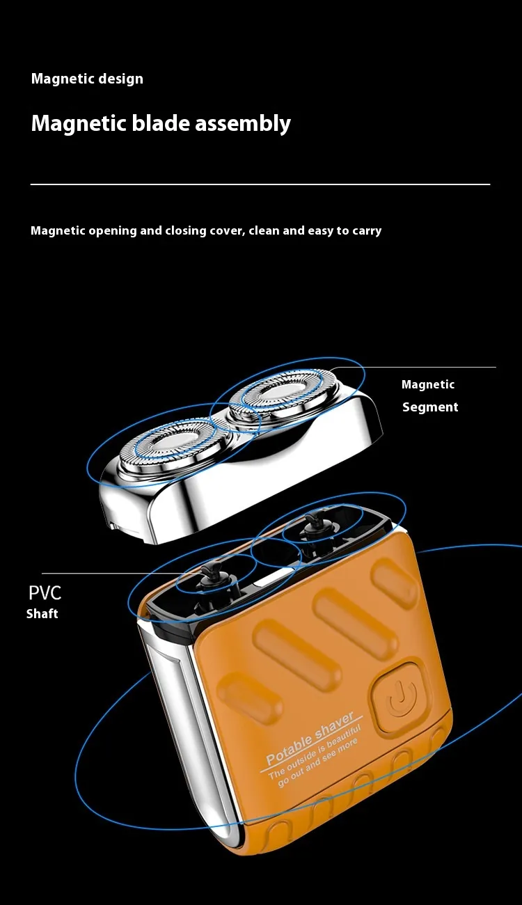 The Portable Rotary Dual Ring Electric Shaver is the perfect grooming tool for men who demand precision, convenience, and efficiency while on the go. Featuring a dual-ring magnetic blade head design, this shaver delivers a superior shaving experience with its smooth performance and ability to handle various hair types. Its compact and portable design makes it ideal for travel, ensuring you can always stay well-groomed no matter where you are. Whether you're at home, on a business trip, or enjoying a vacation, this mini electric shaver is the ideal solution for quick, close, and comfortable shaves.