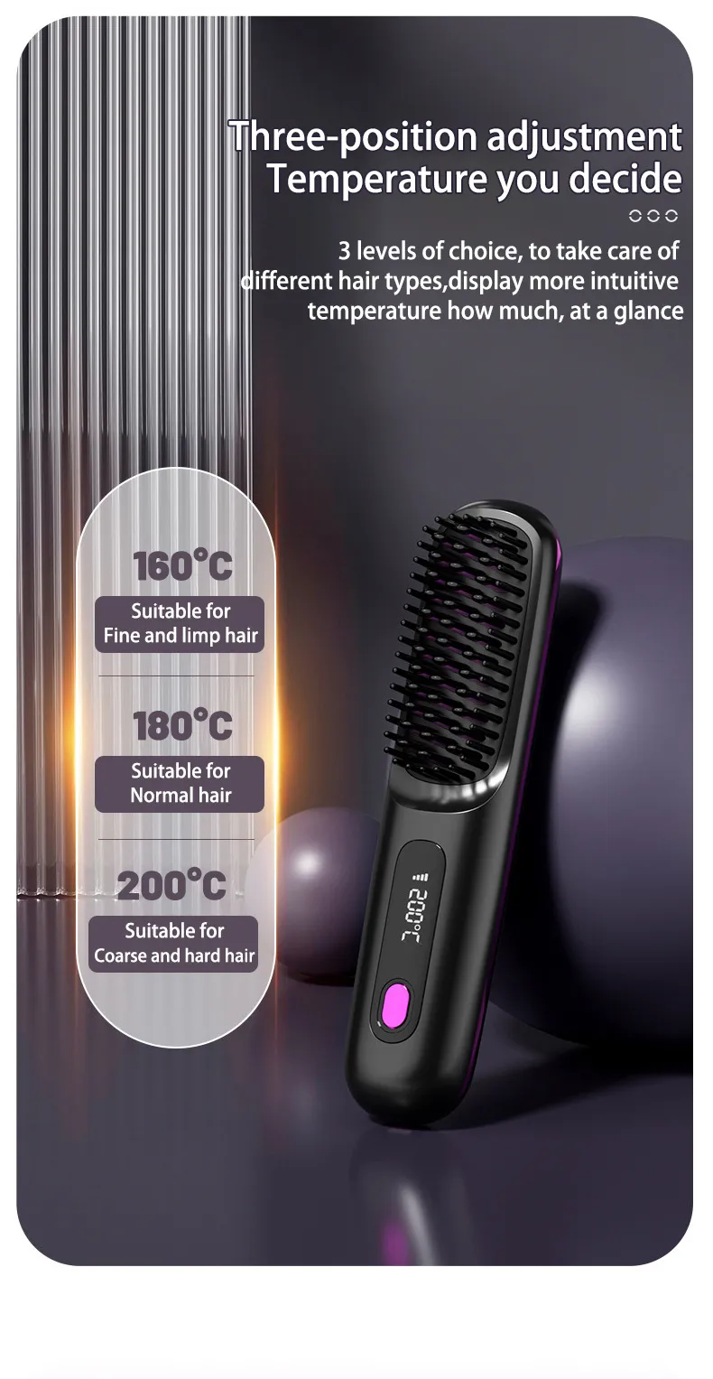 Cordless Hair Straightener Brush: Enjoy salon-worthy styling anywhere with our lightweight (0.6 lbs) cordless straightening brushes. Ditch tangled cords and outlets—its compact design slips seamlessly into your bags for effortless touch-ups at work, on trips, or during daily routines.3-4 Uses on One Charge: Powered by a built-in 2000mAh rechargeable battery, this straightening comb delivers 35 minutes of cord-free styling per charge. The LED indicator displays real-time power levels, while the USB-C port enables rapid recharging. To use, select your ideal temperature setting and glide through salon-quality styling effortlessly.
