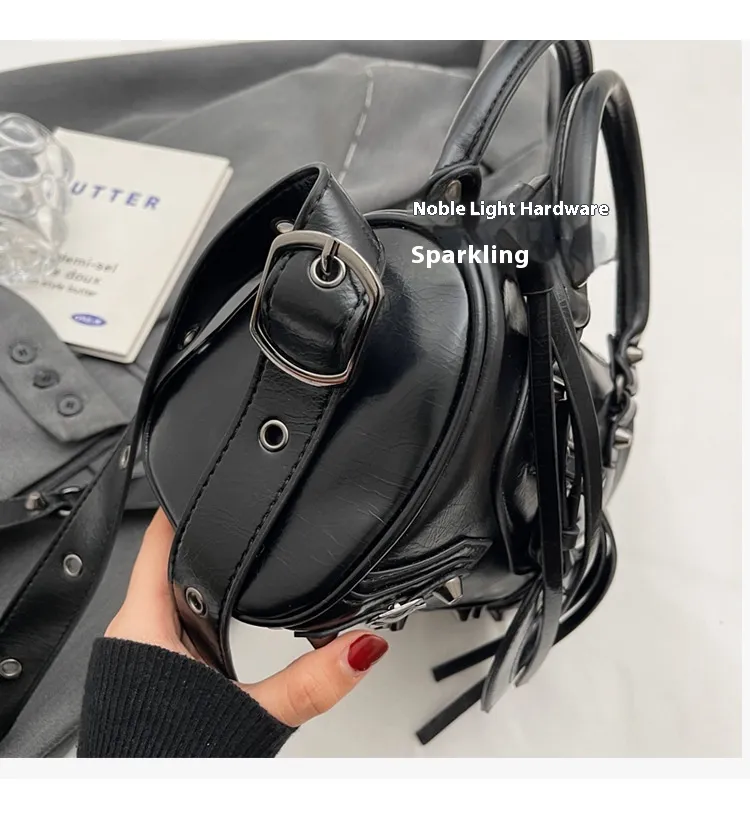 The decorative tassels and rivet embellishments give this bag a trendy and edgy vibe, making it a standout accessory for any occasion.