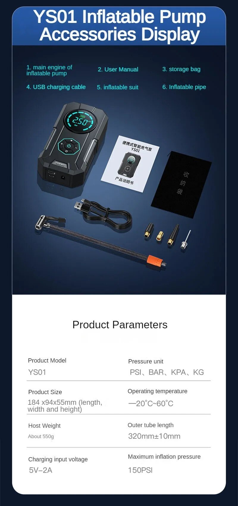 The car tire inflator has 4 types of preset inflation modes (cars, bicycles, motorcycles, and balls) are convenient for beginners to choose from. The manual mode allows you to set pressure values (5-150psi) according to the inflation object. The operation is simple, easy to use, and meet your various inflation needs. Besides, its compact size can easily fit in your car, bicycle rack or backpack.