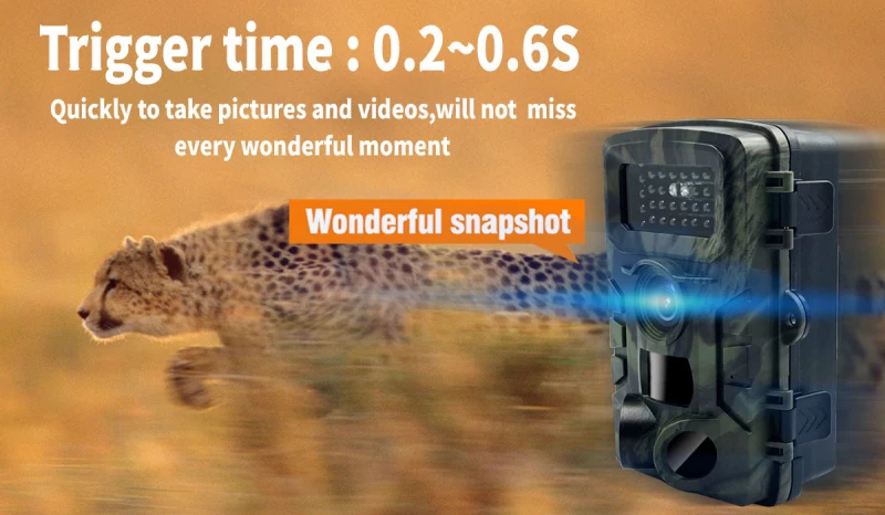 Equipped with a highly sensitive PIR motion sensor, the camera activates instantly upon detecting movement, ensuring you never miss a moment. The 0.2-second trigger speed captures fast-moving animals with ease.