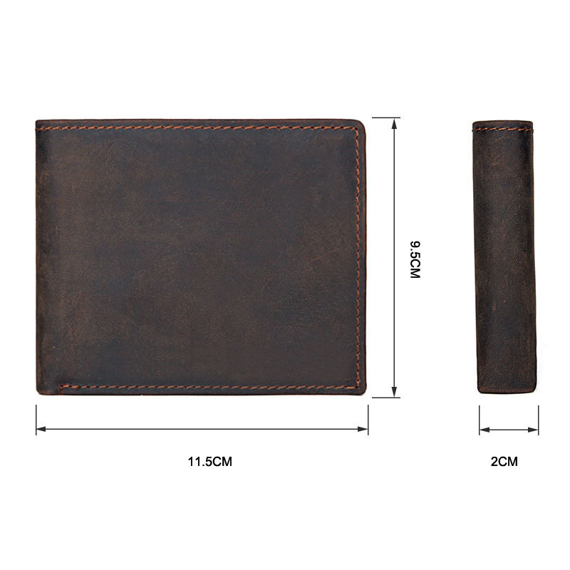 Imbued with the rich heritage of artisanal craftsmanship, each wallet is meticulously handcrafted from the finest top layer Crazy Horse leather. This premium leather not only exudes a rugged vintage charm but also boasts remarkable durability, ensuring that your wallet ages gracefully with time, acquiring a unique patina that tells the story of your adventures.