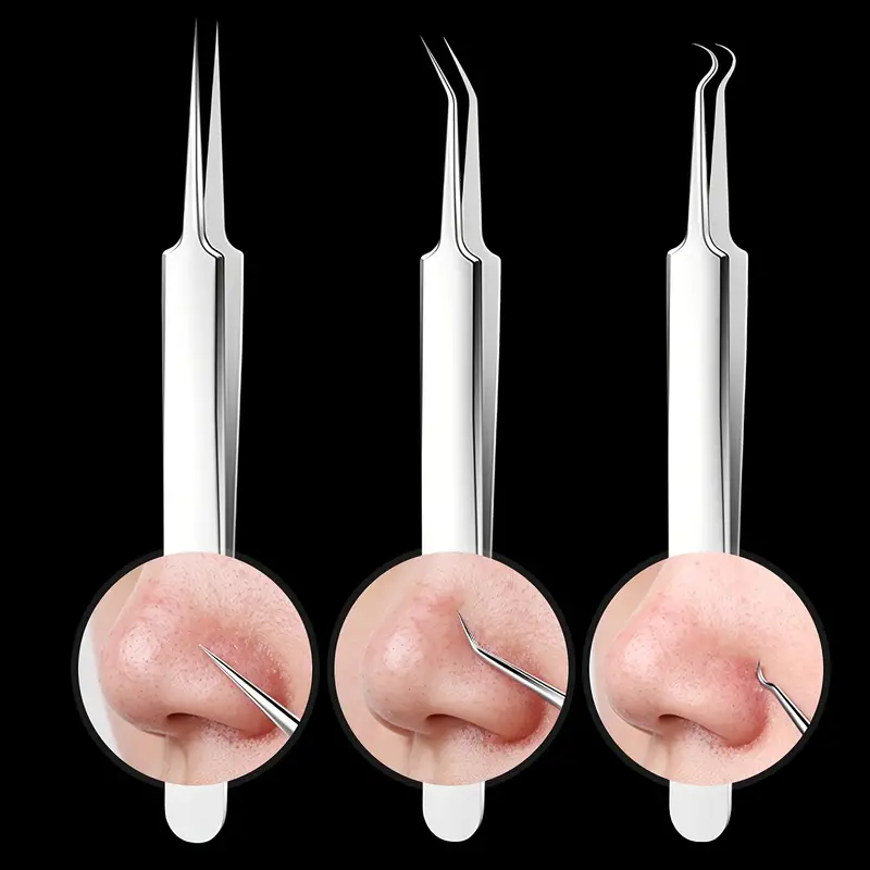 Precision Tips The tweezers feature ultra-precise, curved tips that are specially designed to target and extract blackheads and whiteheads without damaging the surrounding skin. The precision tips make it easy to access even the smallest and most stubborn blemishes.High-Quality Stainless Steel Crafted from surgical-grade stainless steel, these tweezers are durable, rust-resistant, and easy to clean. The high-quality material ensures that the tweezers remain sharp and effective for a long time.Ergonomic Design The tweezers are ergonomically designed for comfort and ease of use. The non-slip grip provides better control, allowing for precise and safe extraction. The lightweight design reduces hand fatigue, making it easier to perform long sessions.Hygienic and Safe Using these tweezers helps minimize the risk of infection and scarring by allowing you to remove blemishes in a controlled and sanitary manner. They can be sterilized easily with alcohol or boiling water, ensuring a clean tool for each use.Portable and Convenient The compact size of the tweezers makes them easy to carry in your makeup bag, purse, or travel kit. They come with a protective cap to keep the tips clean and safe when not in use.Professional Results at Home With these tweezers, you can achieve professional-grade skin care results at home. They are perfect for maintaining clear skin between visits to the dermatologist or esthetician.